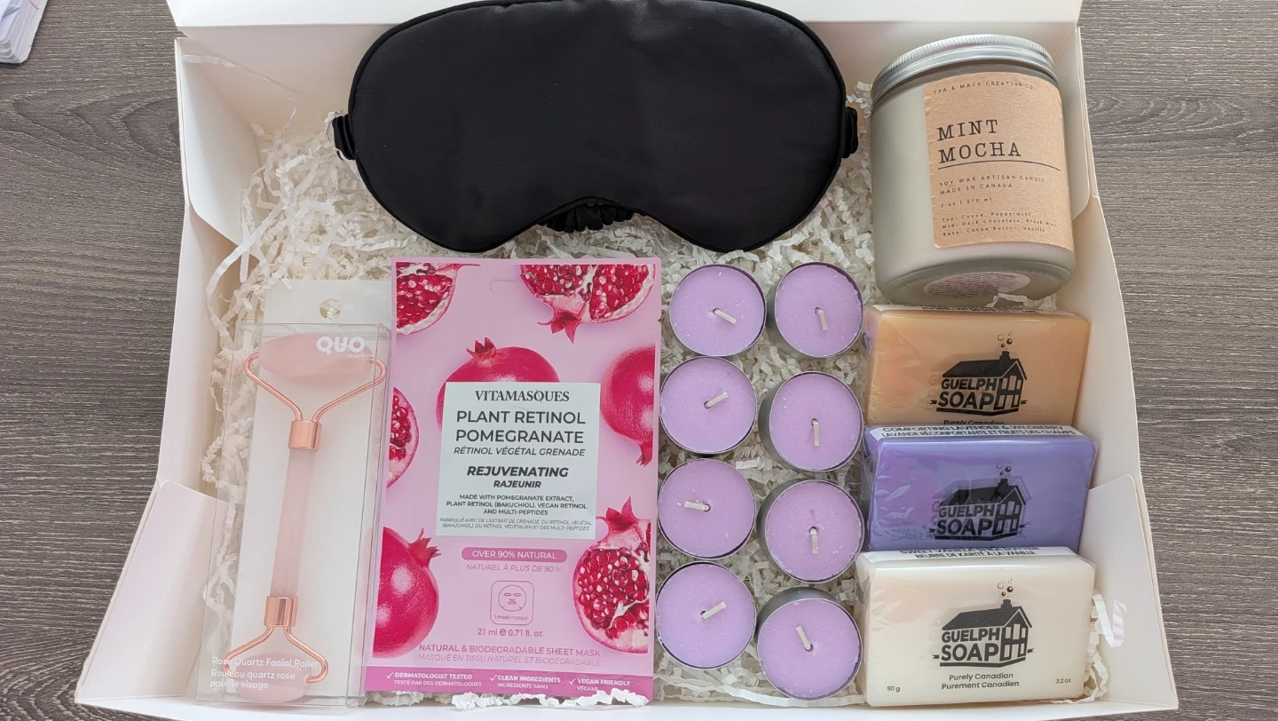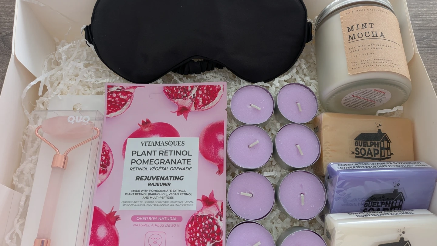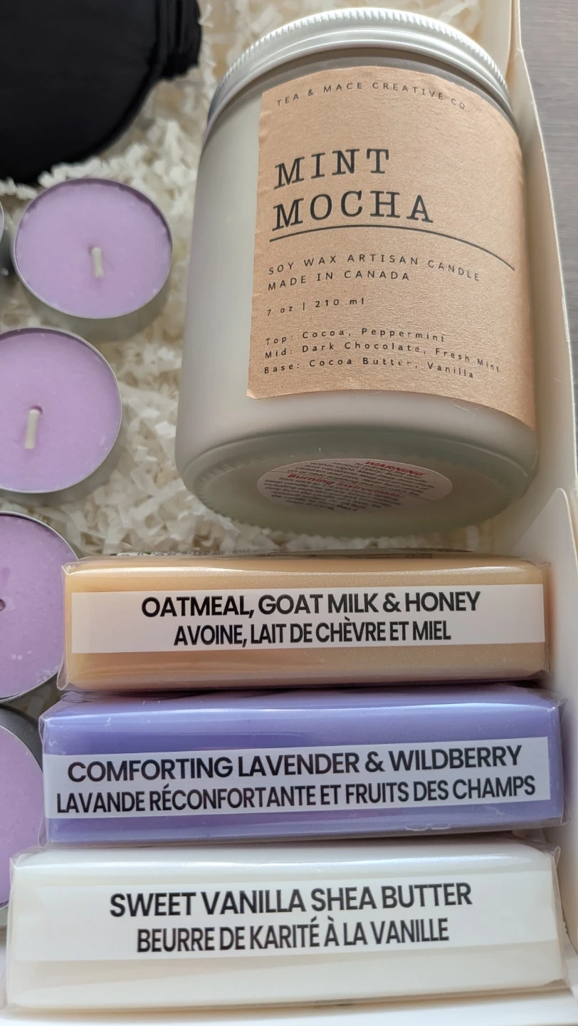 Beautifully curated self-care bundle featuring skincare tools, artisan Canadian soaps, and premium relaxation essentials. Perfect for gifting or creating your own spa night at home.