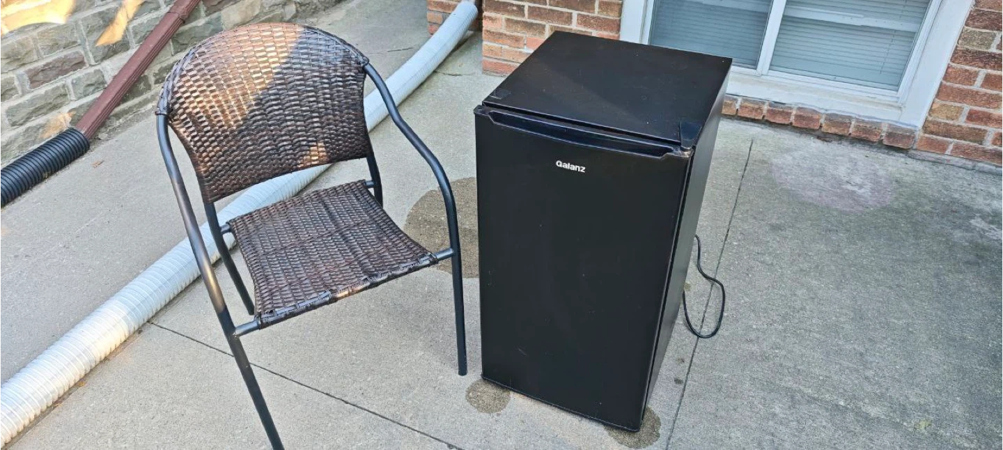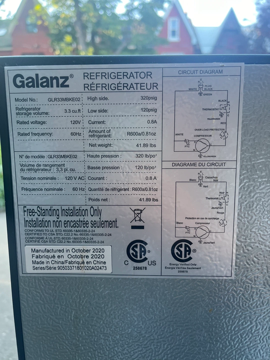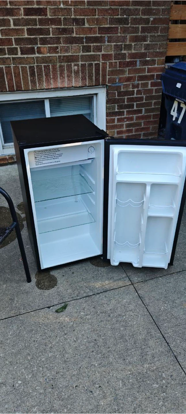 Selling a Galanz mini fridge in black. It's a compact 3.3 cu ft refrigerator, perfect for a dorm room, office, or small apartment.