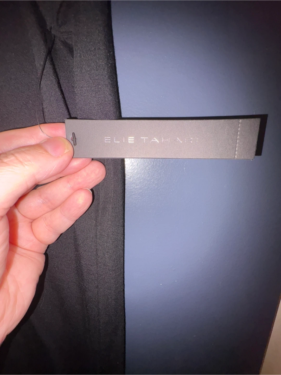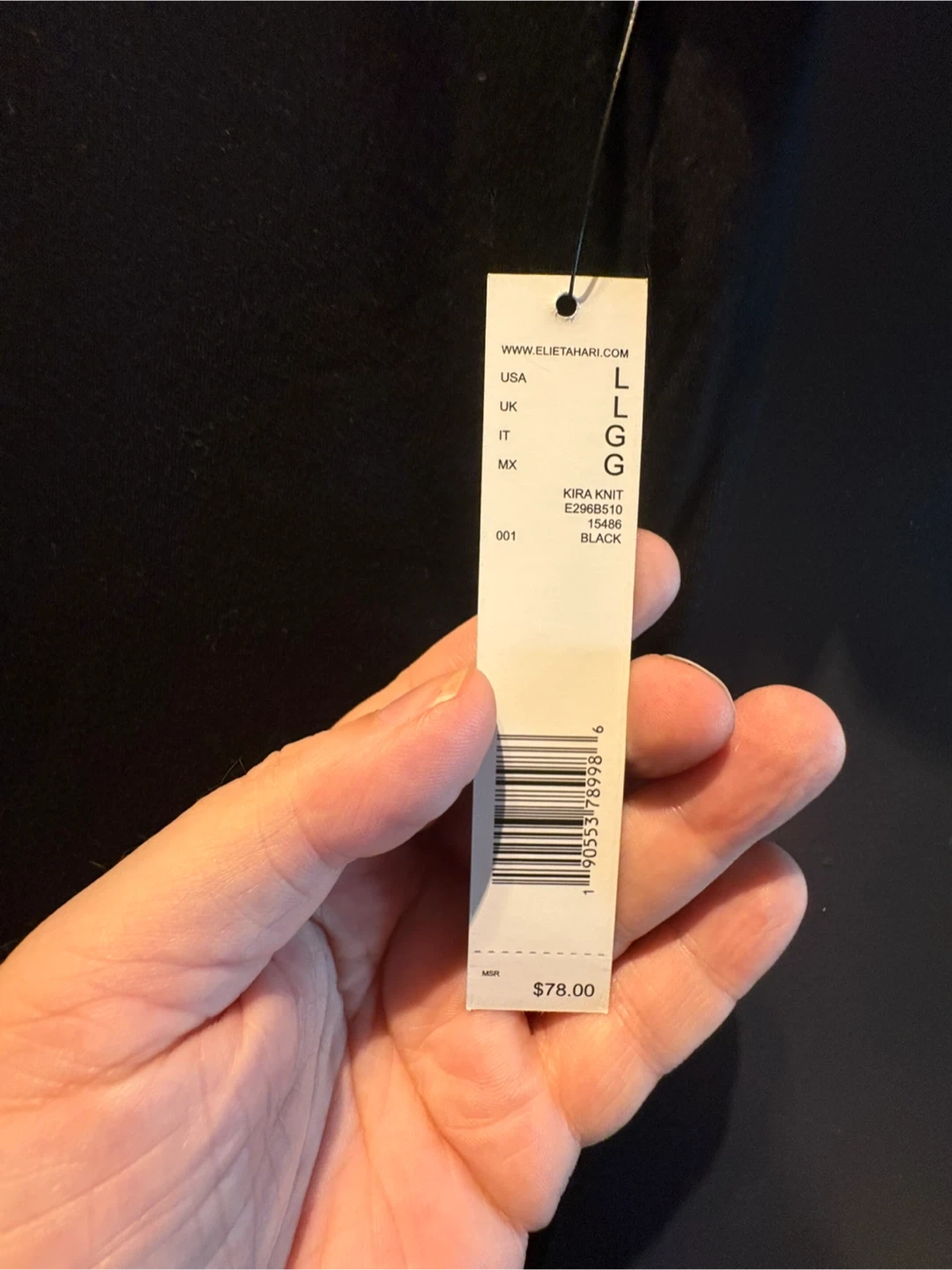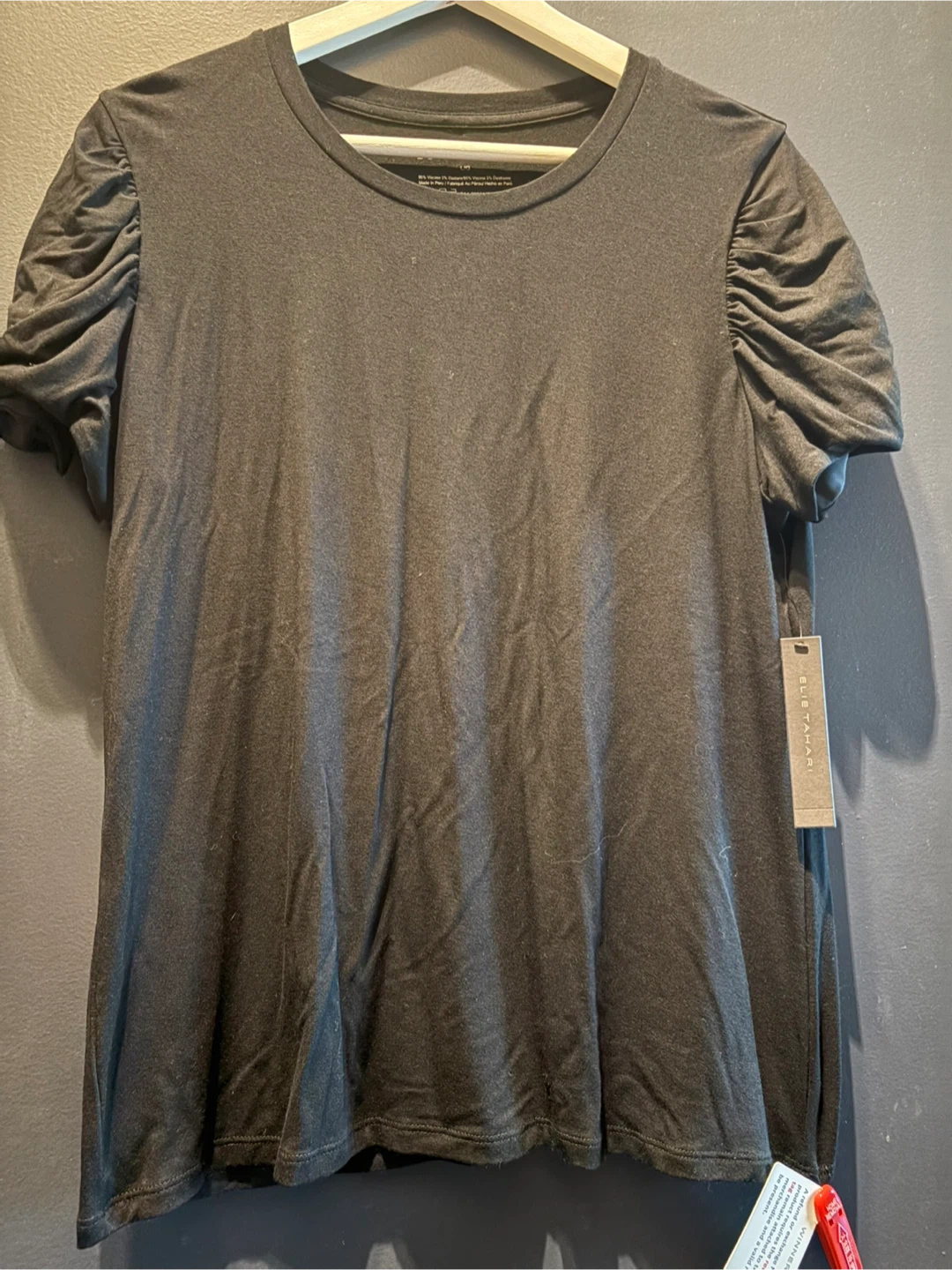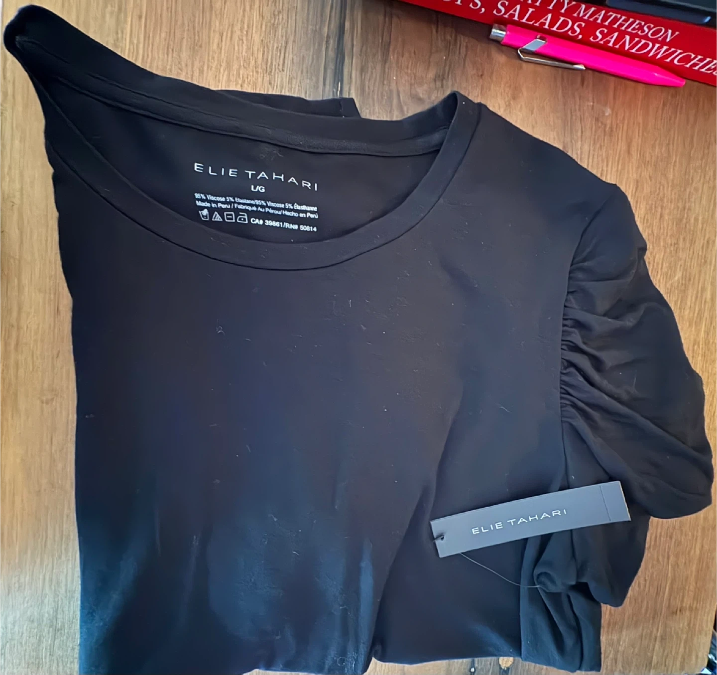 Brand: Elie Tahari Colour: Black Size: Large Style: crew neck t-shirt with slightly puffy sleeves Condition: New with tag retail Price: $78 plus tax NOTE: the red plastic tag is not a store security tag. It is meant to be removed at home (see last photo)