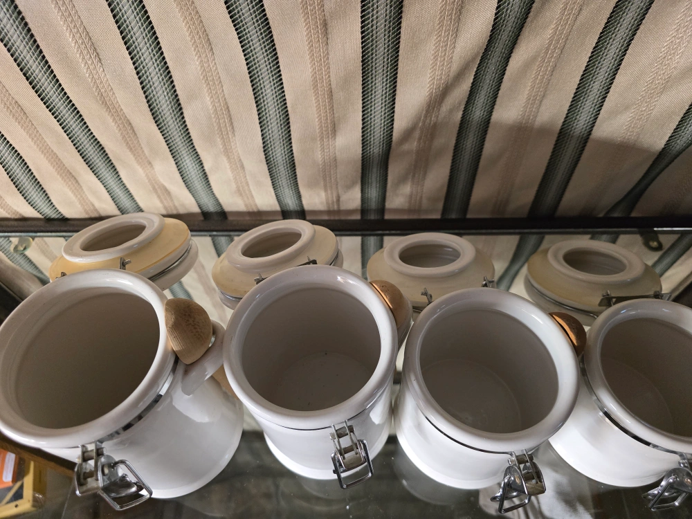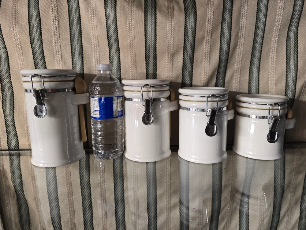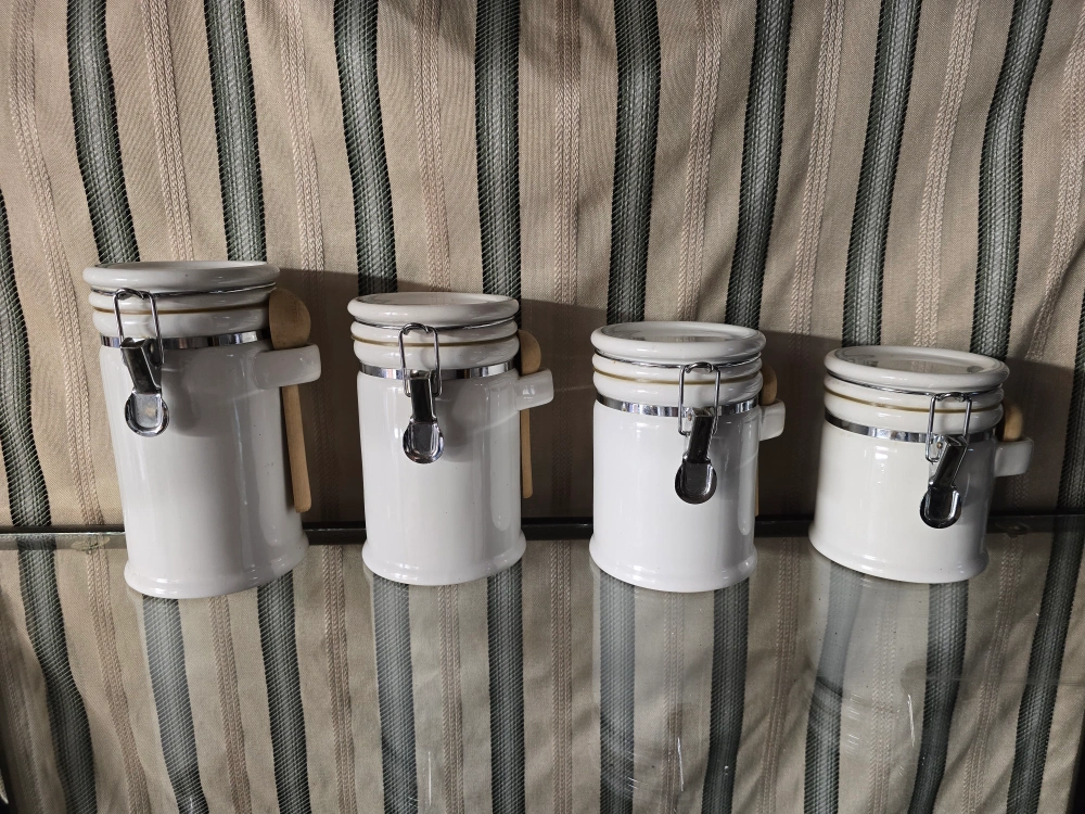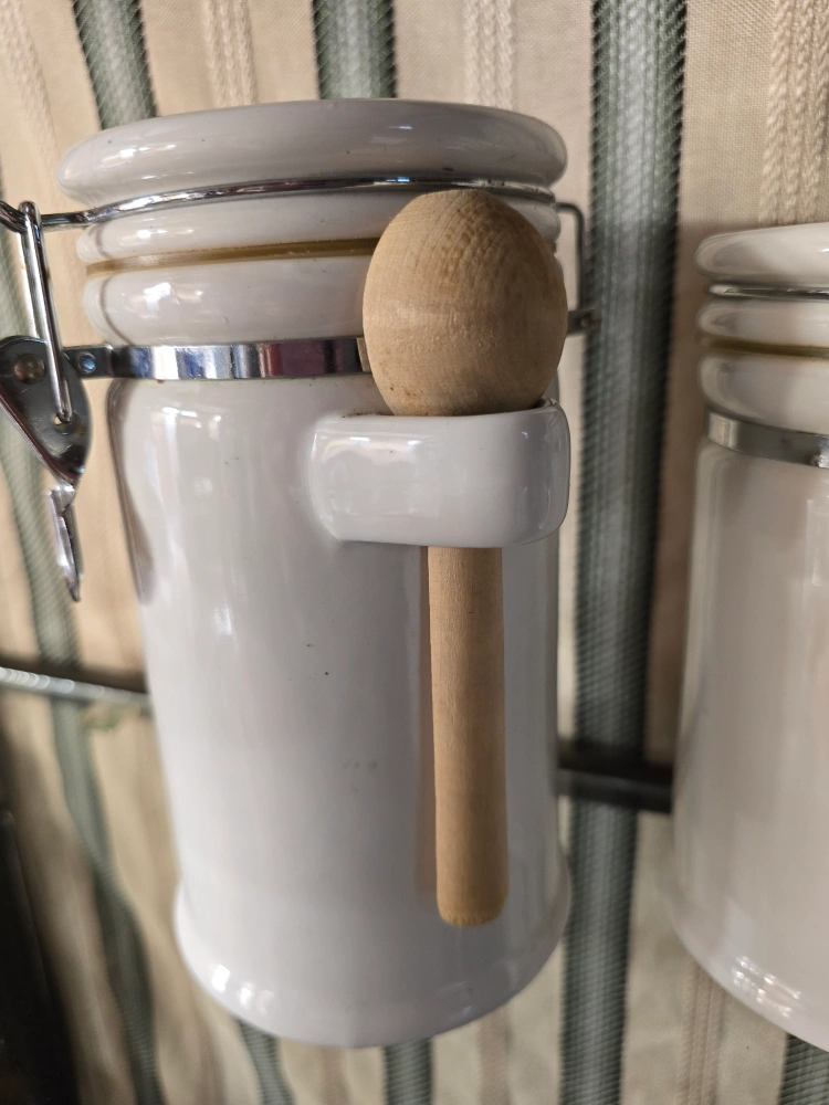 I'm selling a set of white ceramic canisters, each with a wooden spoon. They're perfect for storing spices, coffee, or other kitchen essentials. The canisters feature a secure latch closure to keep contents fresh. They're in great condition and ready to add a touch of charm to your kitchen!