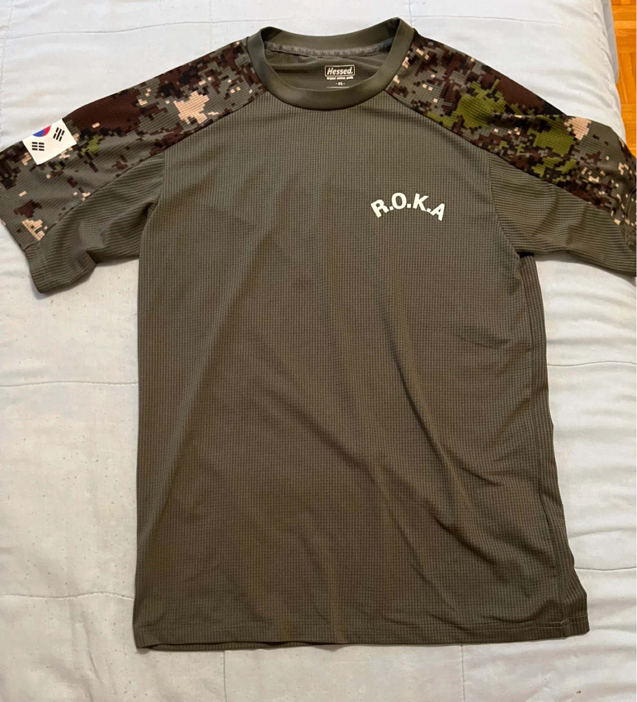 It’s a ROKA (Republic of Korea Army) t-shirt in size M(95). It features a very sporty with breathable fabric since it’s made for soldiers. It’s manufactured by Korean company which produce lots of military clothing , but it is not military supplies, so legal to wear or sell. I bought it from military store inside army.