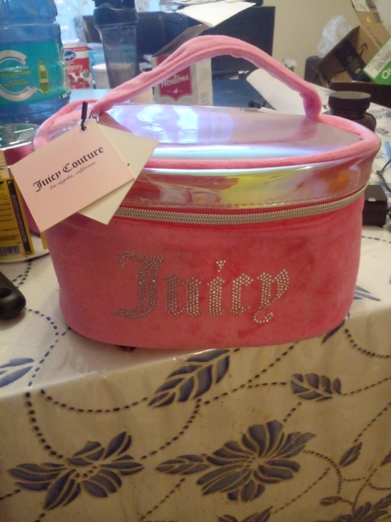 73selling juicy couture pink vanity case perfect for makeup or toiletries and perfect for travel still has the tag on but used once in good condition and looking to sell as no longer needed