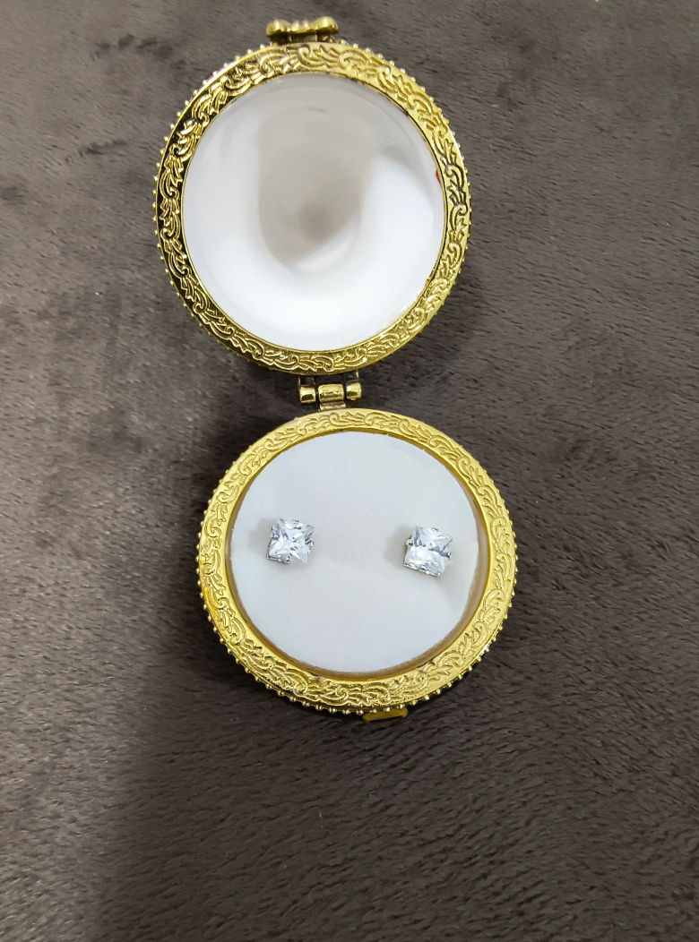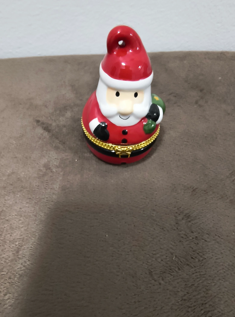 Here's a cute little Santa trinket box! Inside, you'll find a pair of earrings. It's perfect for storing small items or just adding a touch of holiday cheer to your space