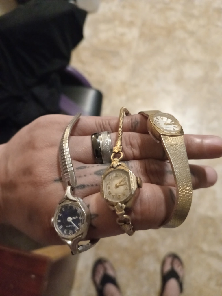These three ladies' watches are a charming collection of vintage timepieces, each with its unique style and character. Unfortunately, I don't have specific specifications for each watch, however i have a variety of vintage styles, each with unique band and face designs. Signs of wear consistent with age, including potential scratches or wear on the bands and faces. Not verified if all are in working order; may require servicing or battery replacement.