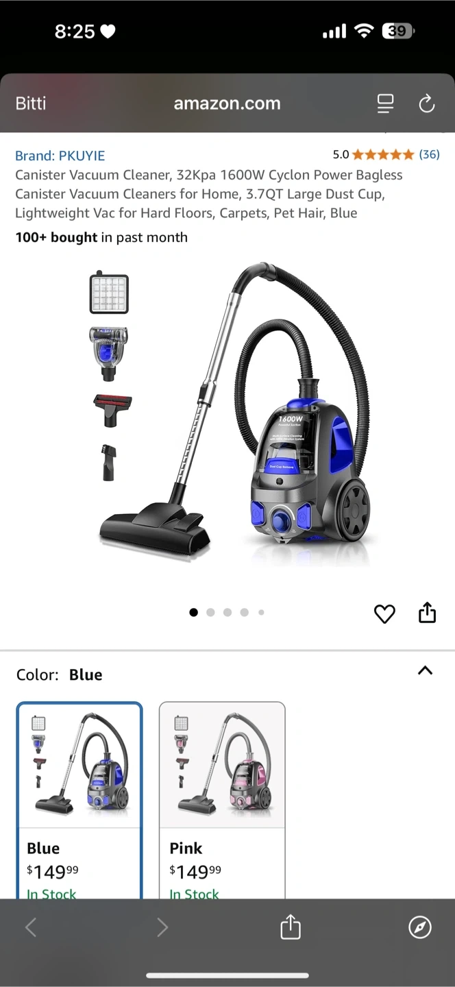 Selling a PKUYIE canister vacuum cleaner in blue! It's a 32Kpa 1600W Cyclon Power Bagless model, perfect for home use. It has a 3.7QT large dust cup and is lightweight, making it great for hard floors, carpets, and pet hair. Originally bought for $149.99