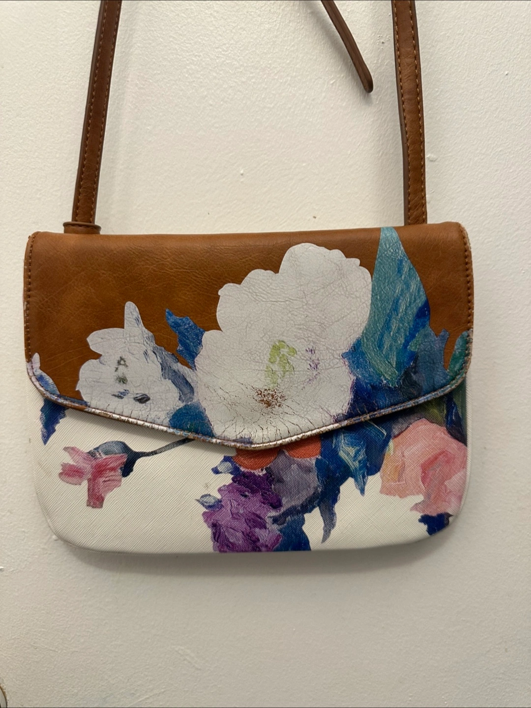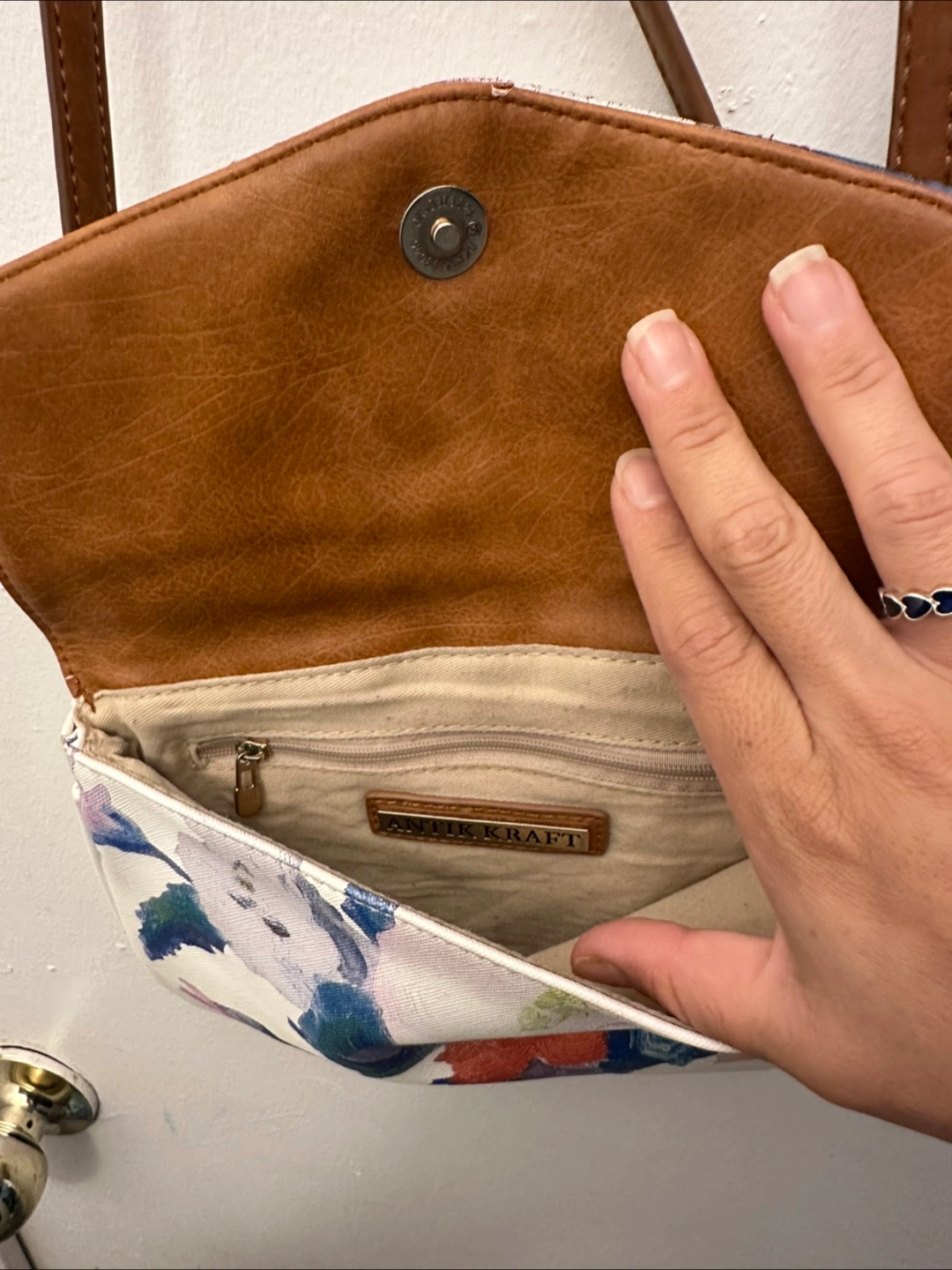 201Here's a cute Antik Kraft crossbody bag! It has a brown and white floral design. The interior has a zipper pocket for your valuables. Great for adding a pop of colour to any outfit!