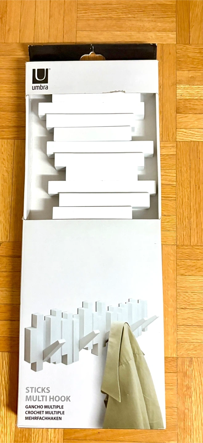 This Umbra Sticks Multi Hook is great for organizing your space. It's in white and comes with the original box. The dimensions are approximately 19 1/4" (49 cm) in length and 7" (17.7 cm) in height. A stylish and functional addition to any home! ‼️Price is non negotiable ‼️ Cash payment only Pick up only