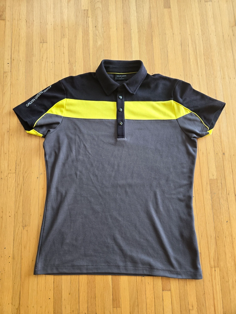 This is a Galvin Green Ventile polo shirt in size small. It features a stylish design with black, yellow, and grey colour blocking. Some pilling from carrying the golf bag. Otherwise great condition!