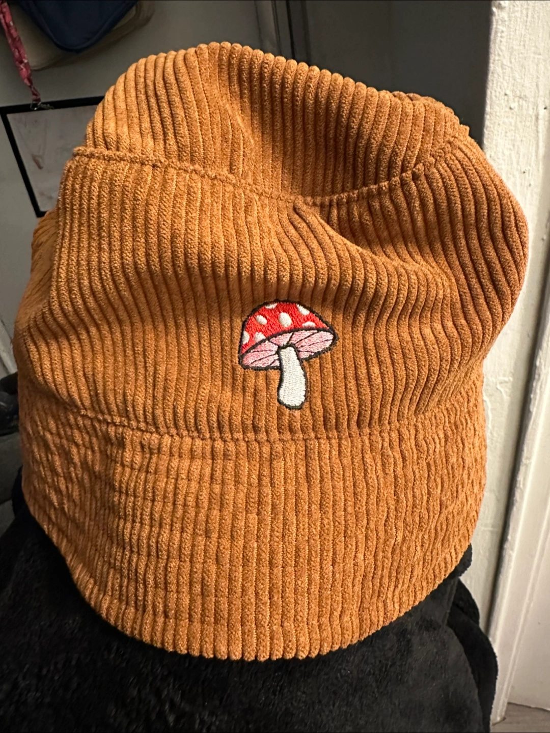 Here's a cute corduroy bucket hat in a nice brown colour. It has a little mushroom embroidered on the front. It's in great condition and ready for a new home!