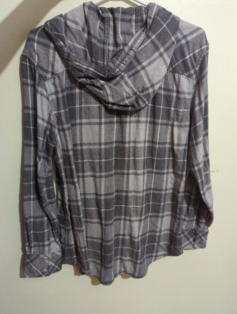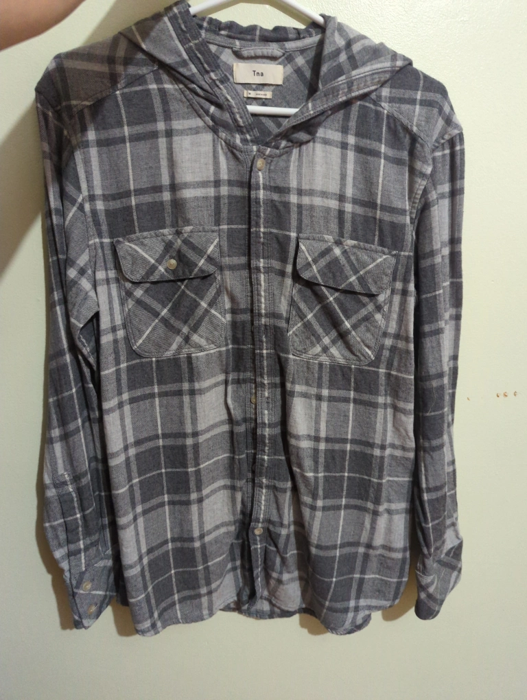 Selling a TNA hooded flannel shirt in a grey plaid pattern. It features a hood and two chest pockets. no rips size: M