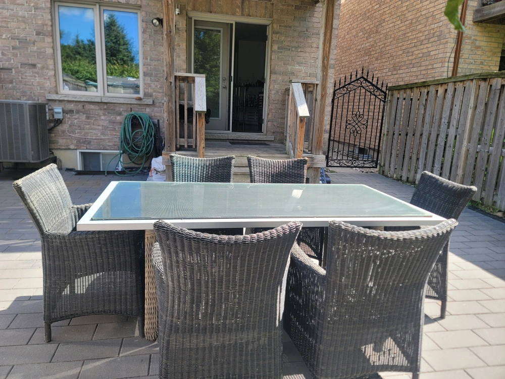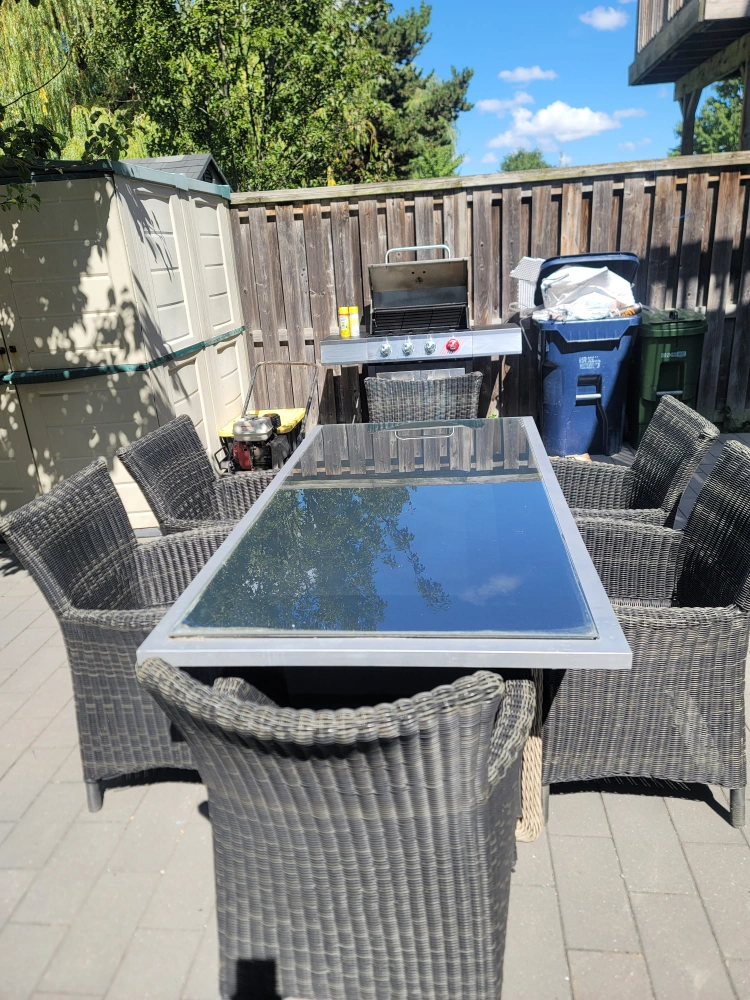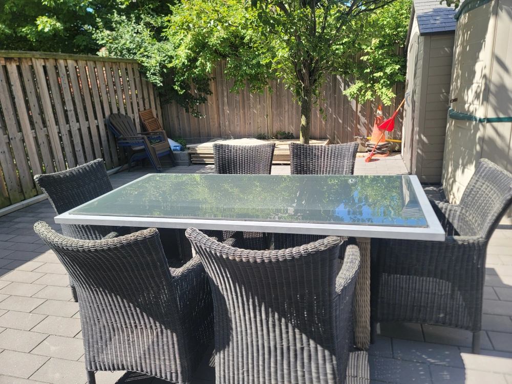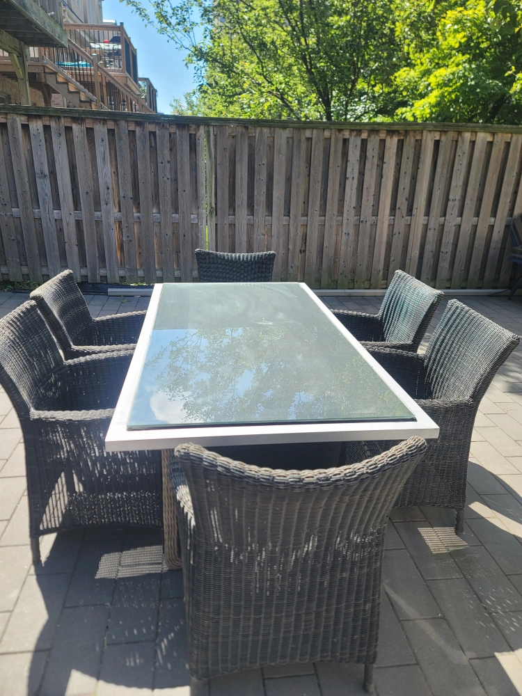 24Selling a lovely outdoor dining set! It includes a rectangular table with a glass top and six wicker chairs. Perfect for enjoying meals outside with family and friends in the summer months. The set is in good condition and ready for a new home!