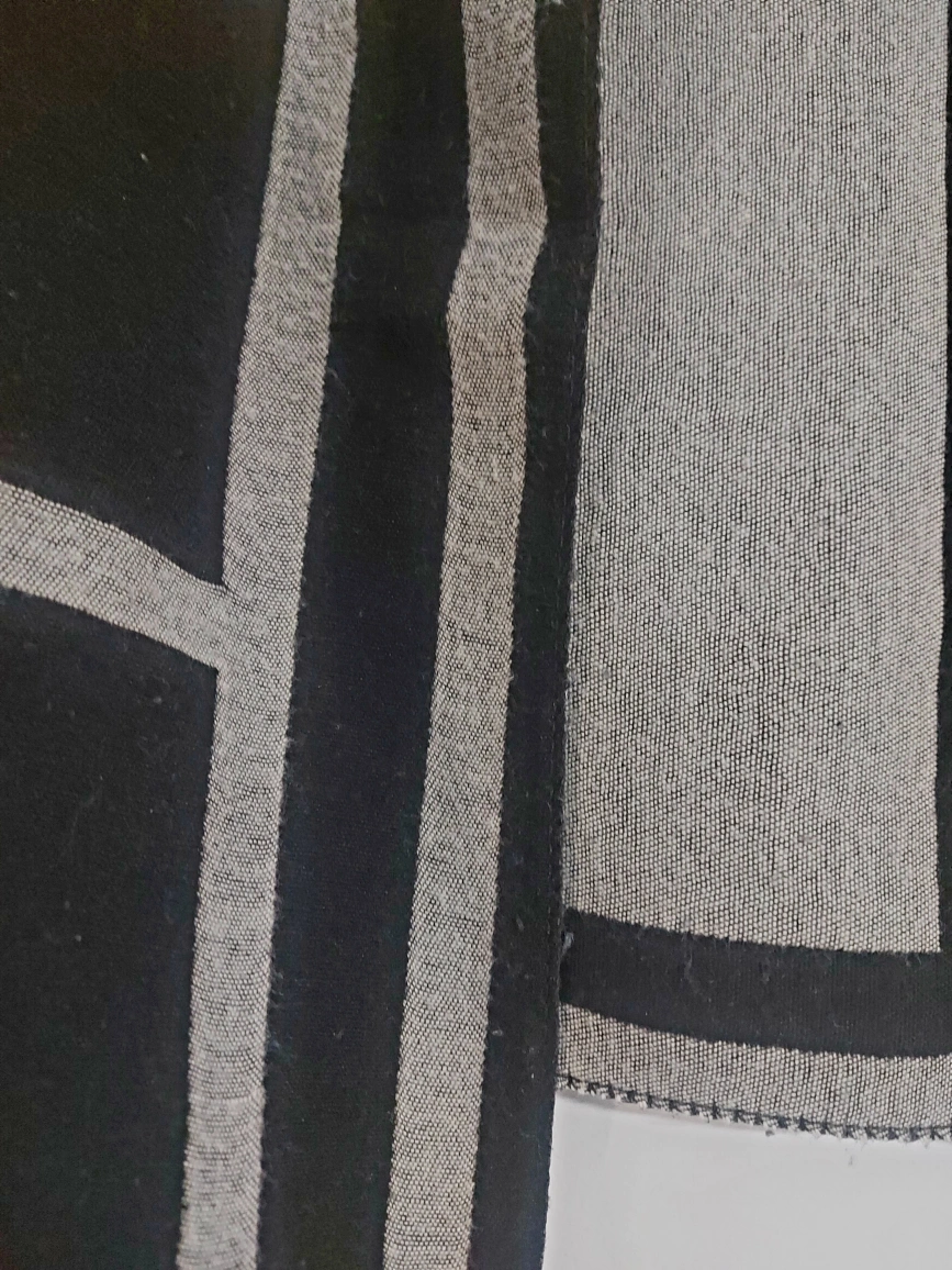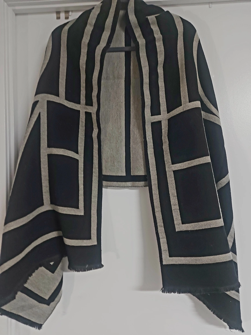 579Selling a stylish scarf with a striking striped design in black and grey. It's a versatile accessory that can add a touch of elegance to any outfit. The material feels soft and comfortable, perfect for keeping you warm on cooler days