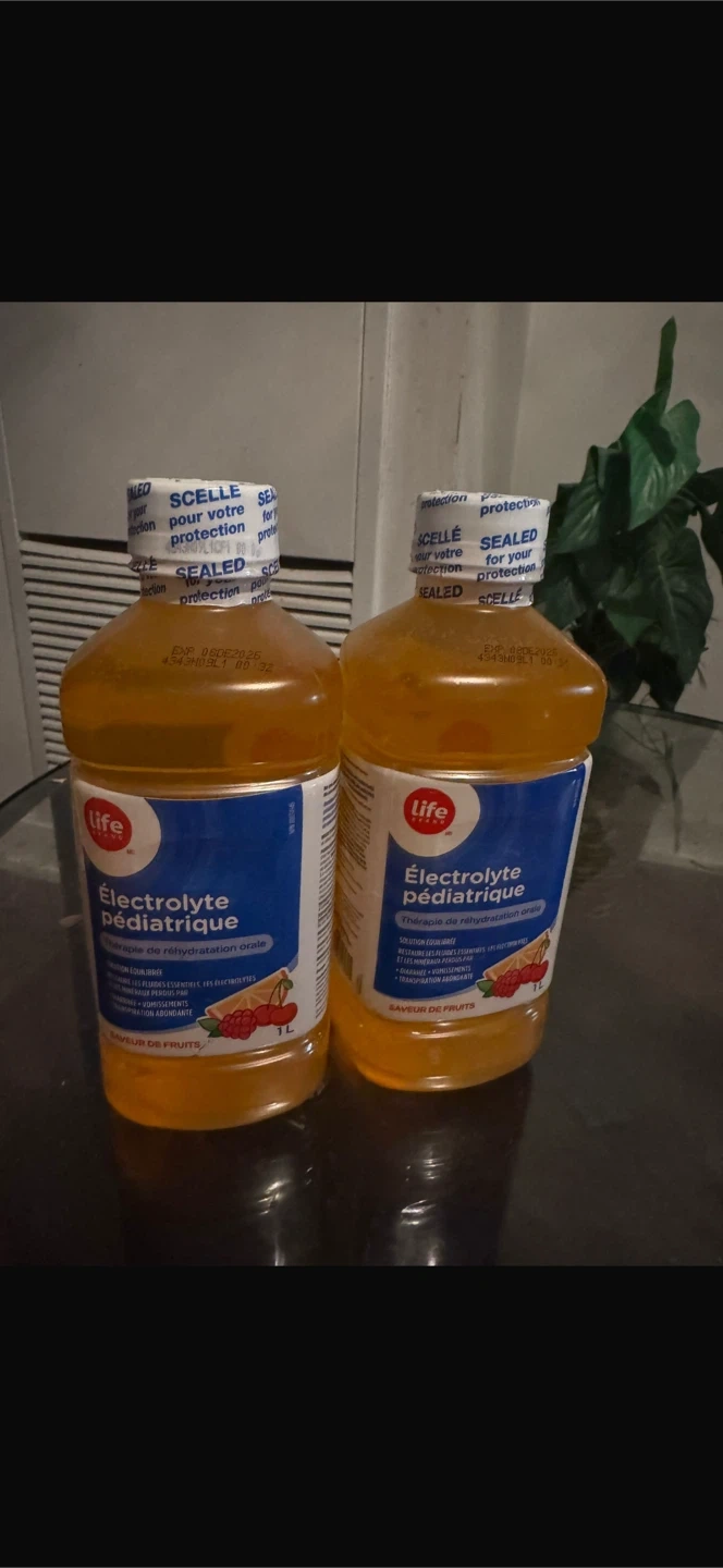 23Selling two bottles of Life Brand Electrolyte Pediatrique oral rehydration therapy. They are fruit flavoured and each bottle contains 1L. Expiry date is 2026 December 06