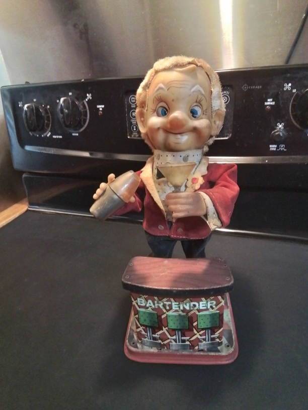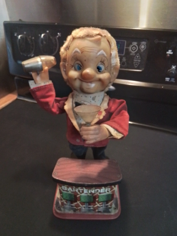 vintage Rosko Bartender tin toy from the 1960s, made in Japan This is a vintage Rosko Bartender tin toy from the 1960s, made in Japan, and it's a real piece of nostalgia! While it shows signs of its age, it still has a ton of charm.This battery-operated toy features a bartender figure with a shaker, and a bar with three panels. The toy is often sold as a collectible item. See images for details on condition. This toy is a quirky addition to any collection, bringing a touch of retro fun to your space. Don't miss out on owning a unique piece of toy history! If the ad is still up, then yes, it's still available. Pickup at Yonge Street and Steeles Avenue