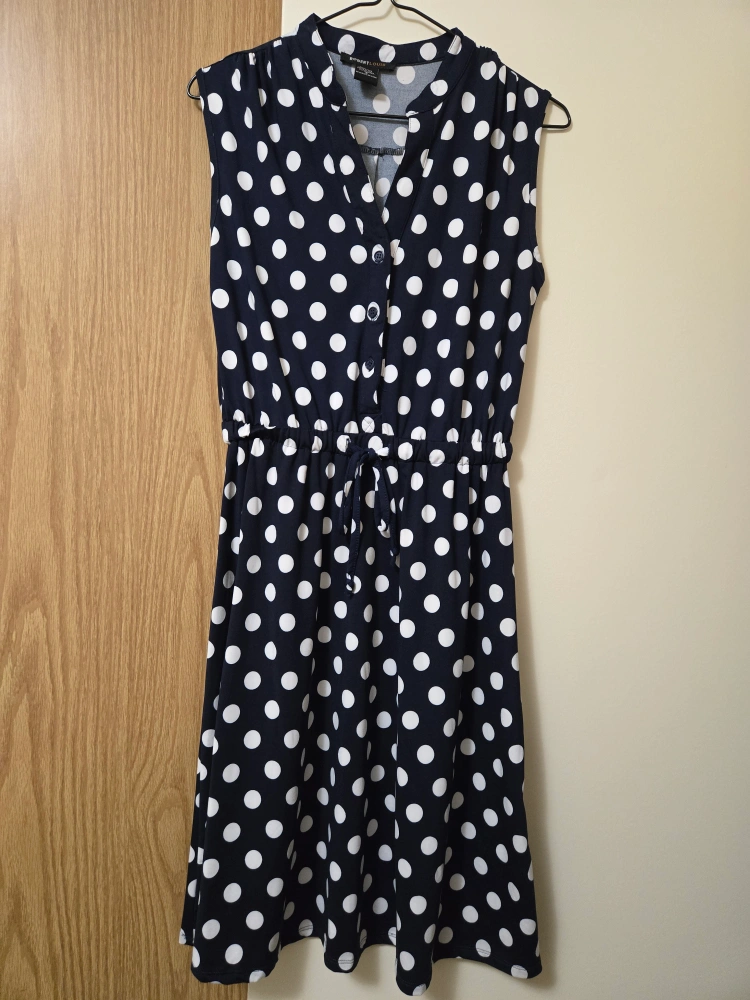 This Robert Louis dress features a fun blue and white polka dot pattern. It's a size small and made of 92% polyester and 8% spandex. Perfect for a casual day out!