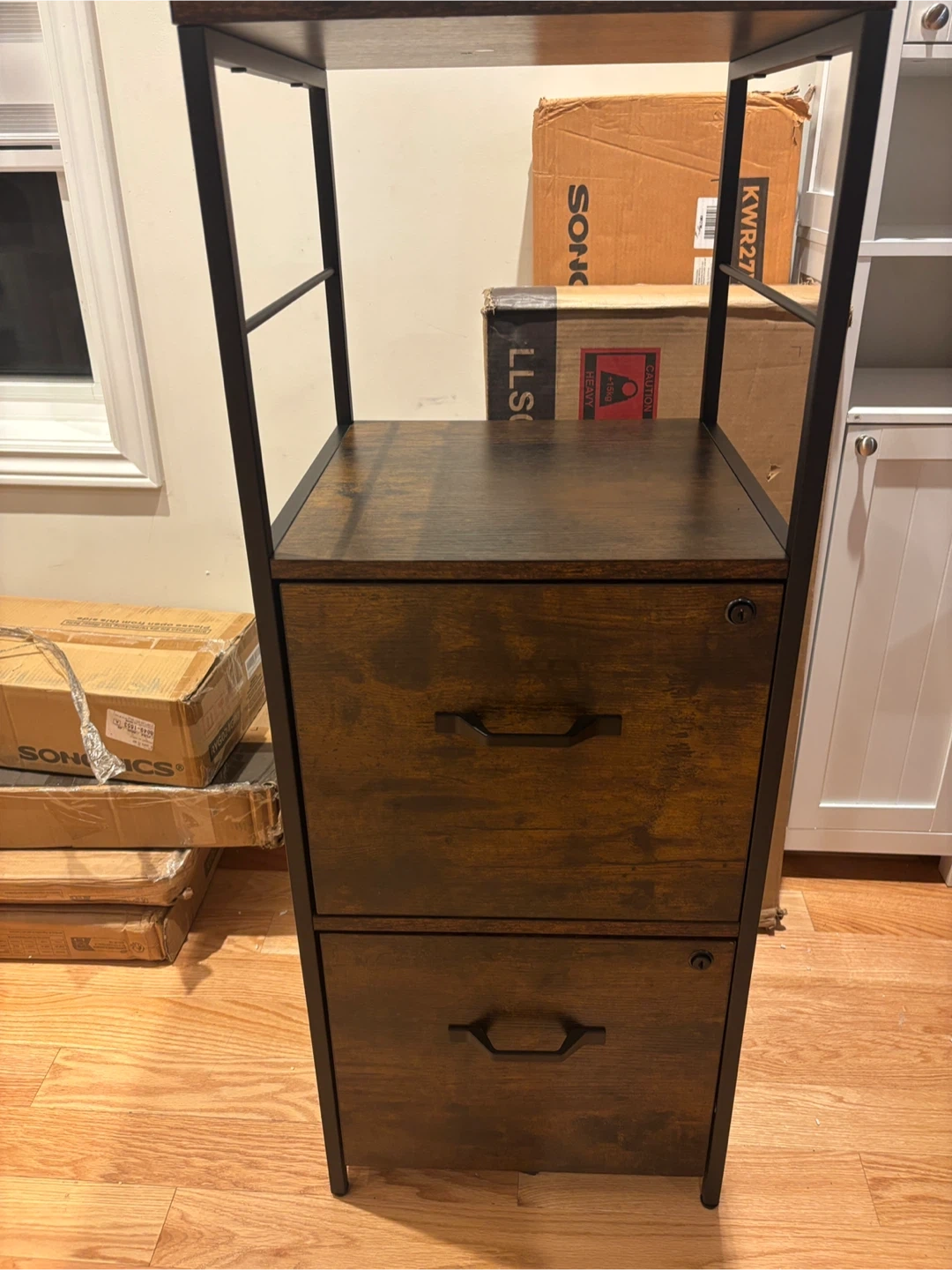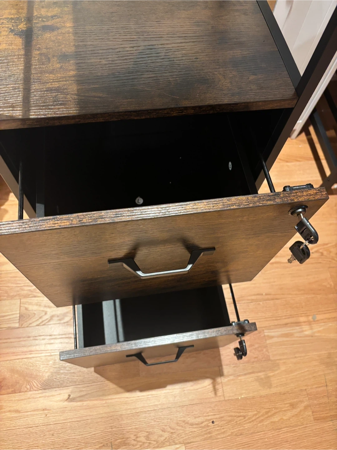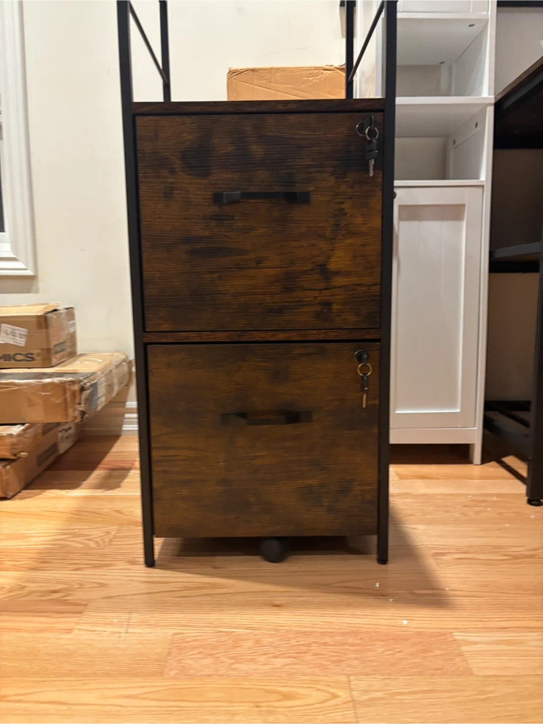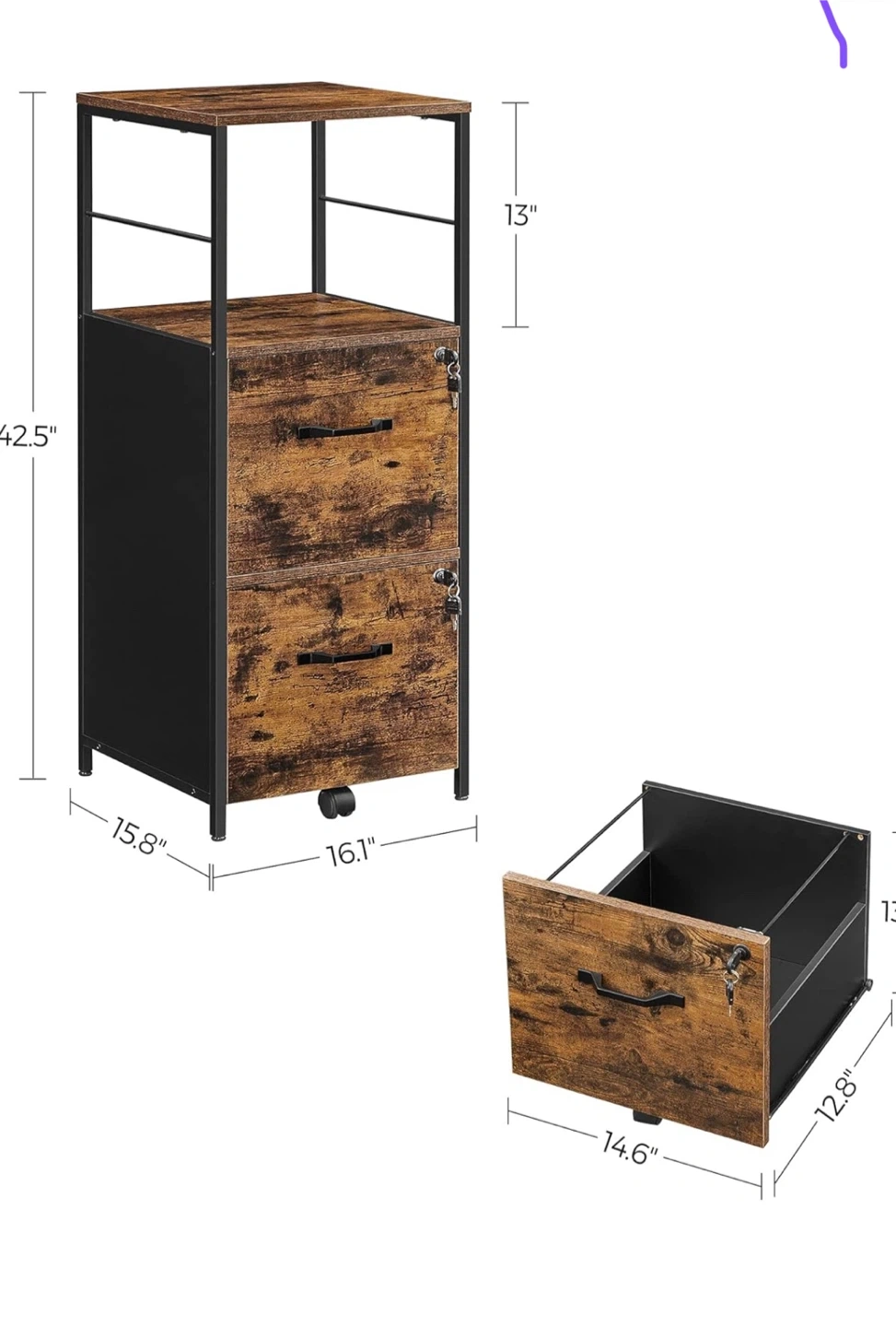 This wood and metal file cabinet is great for adding some extra storage to your home office! It features two drawers for holding files and other office supplies. The cabinet has a rustic wood finish and a black metal frame. Available for pickup and delivery