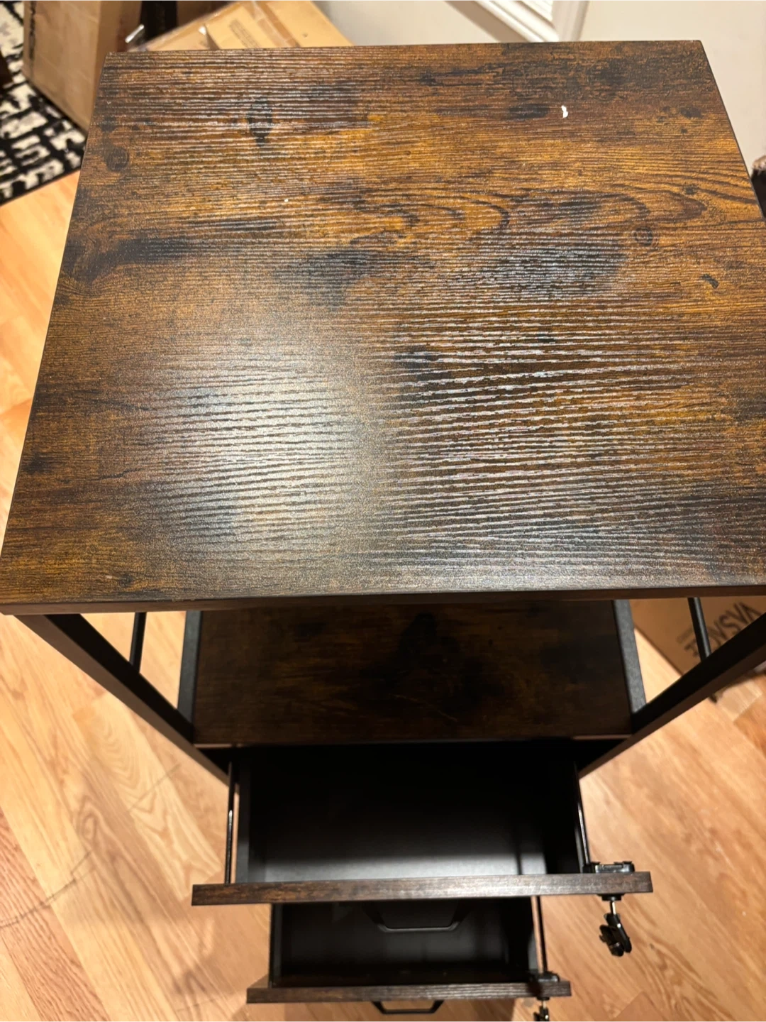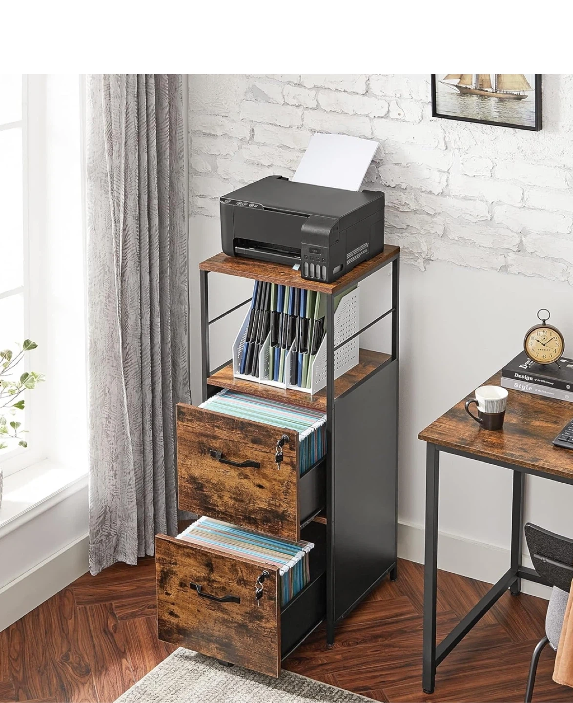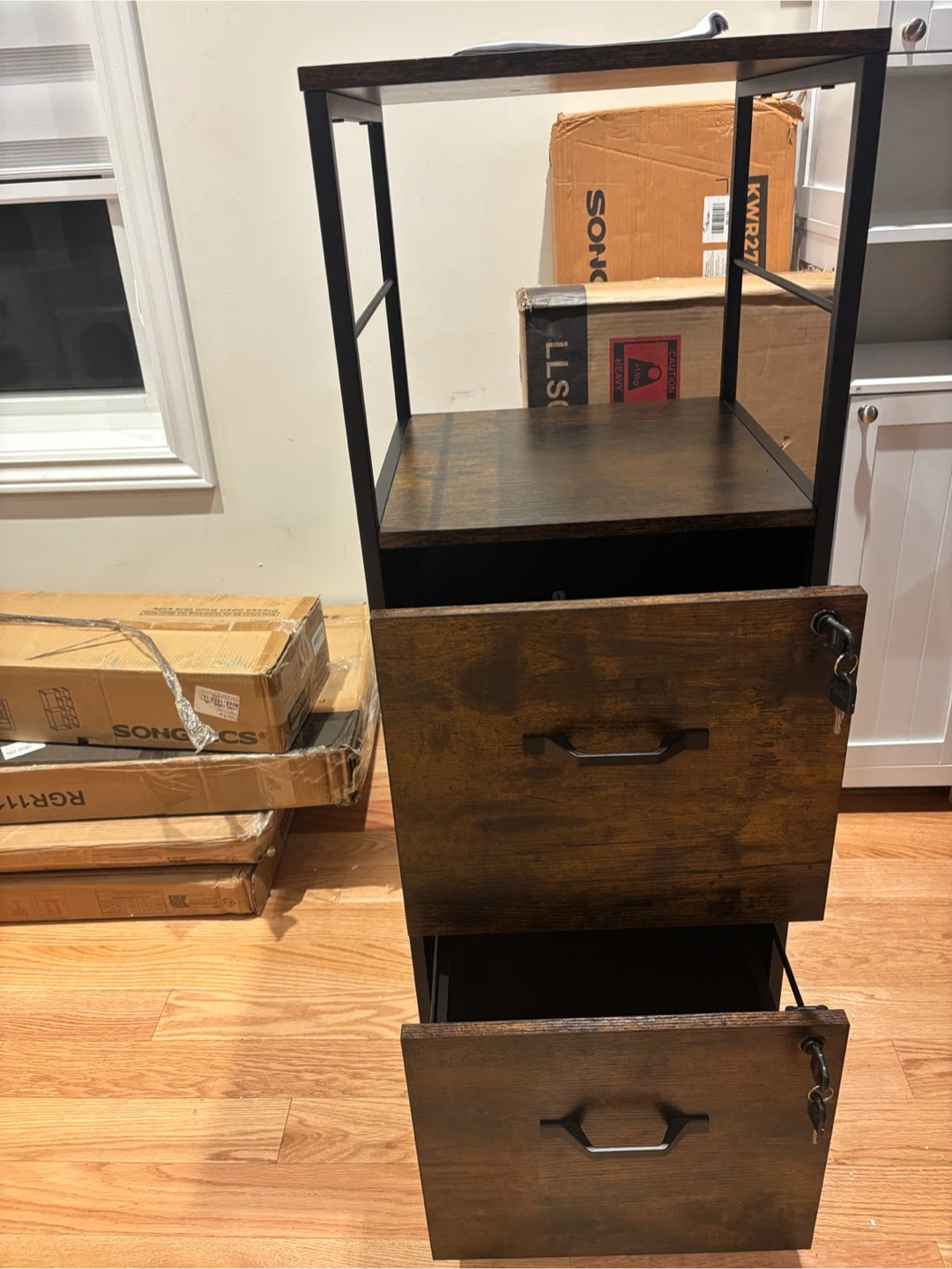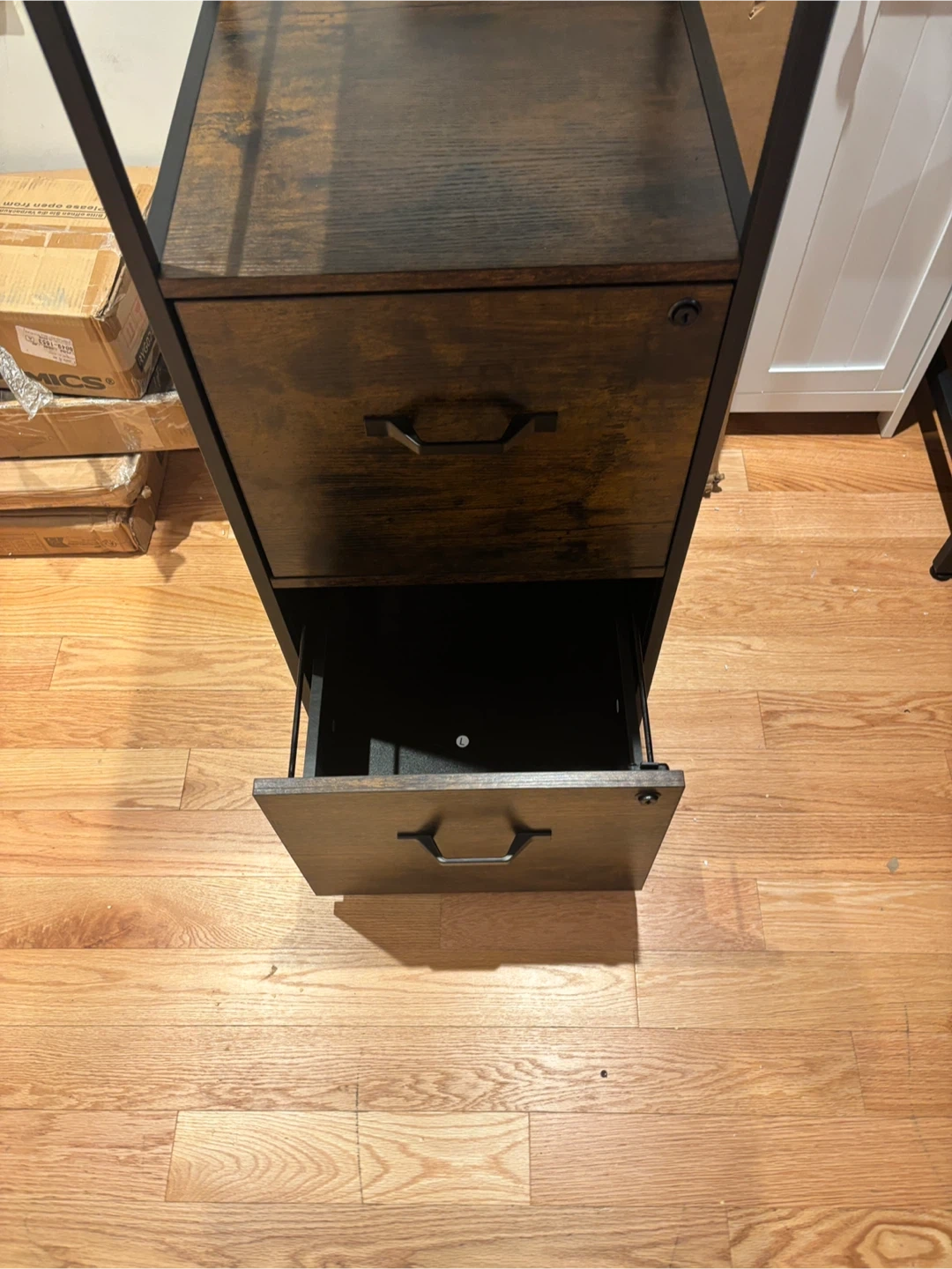 This wood and metal file cabinet is great for adding some extra storage to your home office! It features two drawers for holding files and other office supplies. The cabinet has a rustic wood finish and a black metal frame. Available for pickup and delivery