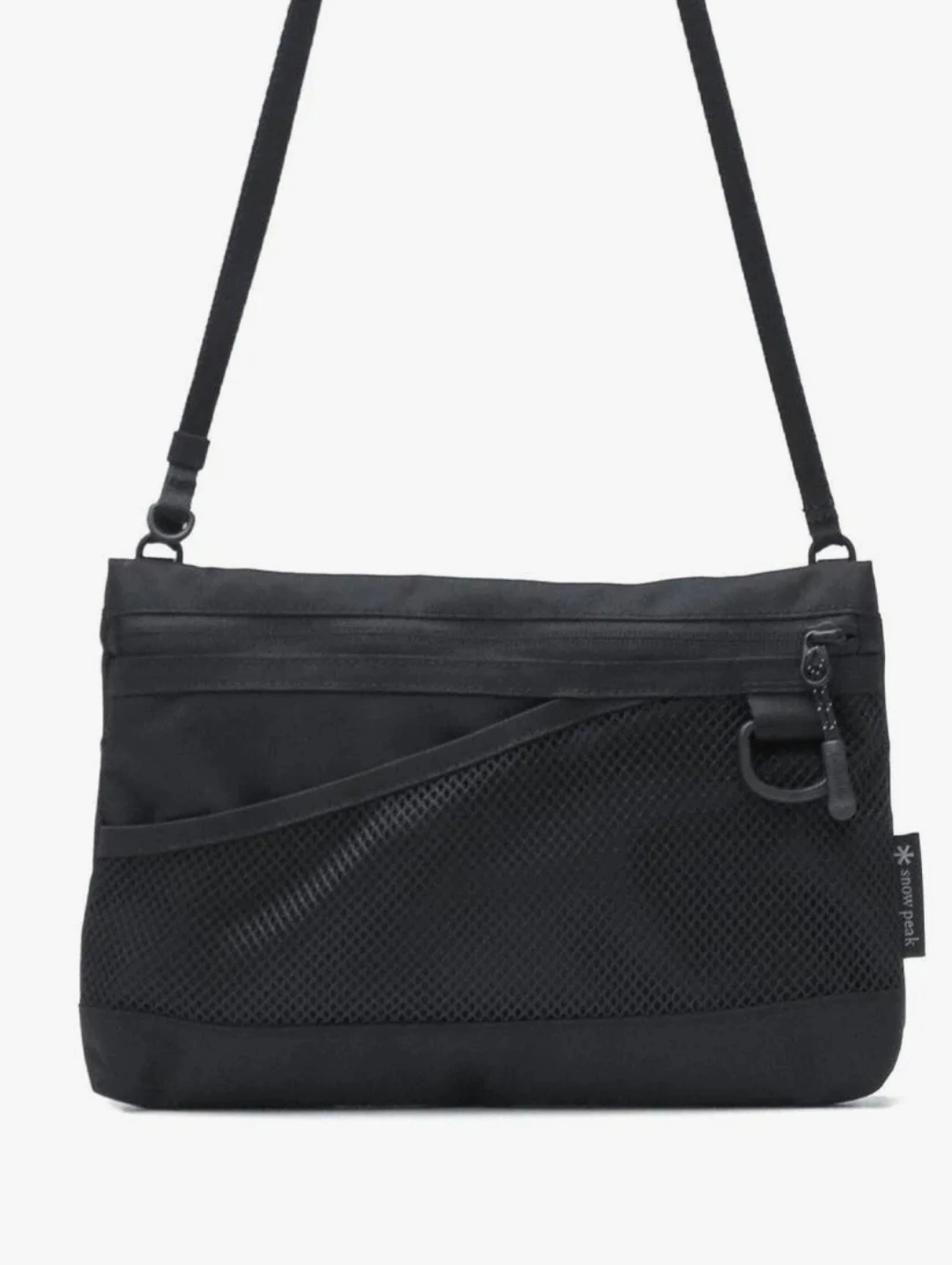 This black Snow Peak Active Sacoche bag is perfect for carrying your essentials! It features a mesh front pocket and a zippered main compartment to keep your belongings secure. The adjustable shoulder strap ensures a comfortable fit. Great for everyday use or outdoor adventures