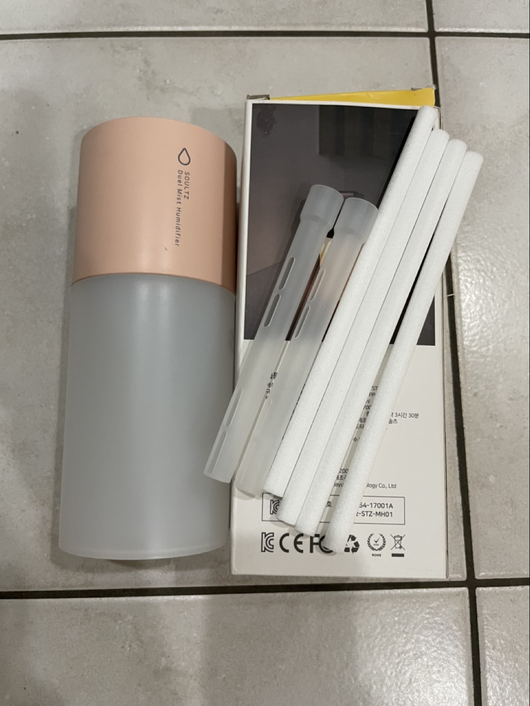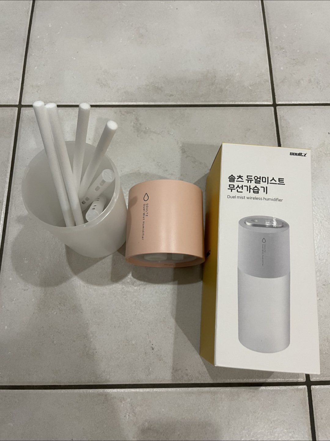 It comes with the box and all the original components. It has a 300ml water tank and can run for up to 4 hours on a full charge (Full charge takes 3.5 hours)