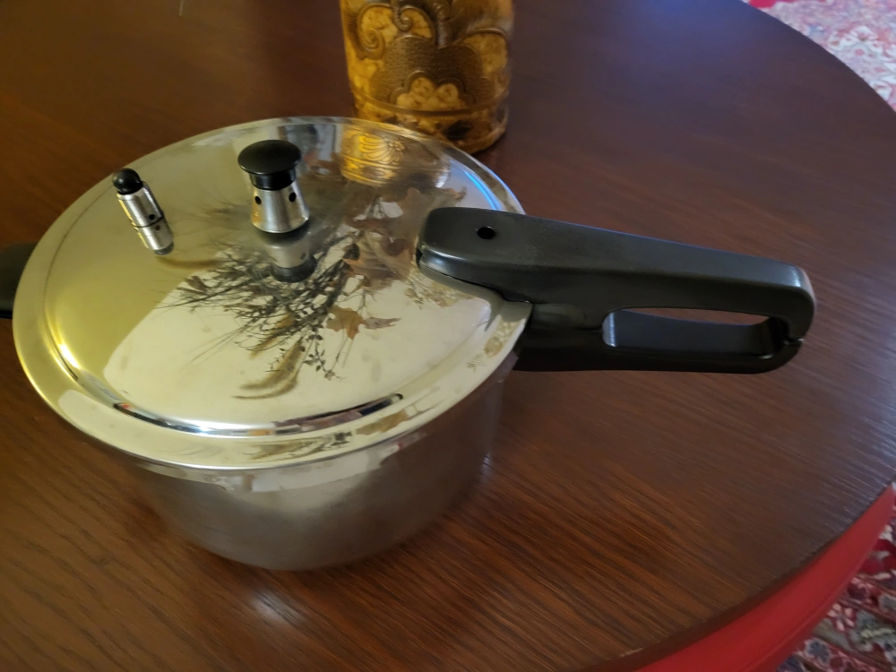 Selling a stainless steel pressure cooker. It's in good condition and ready to help you make some delicious meals! The black handle provides a comfortable grip.