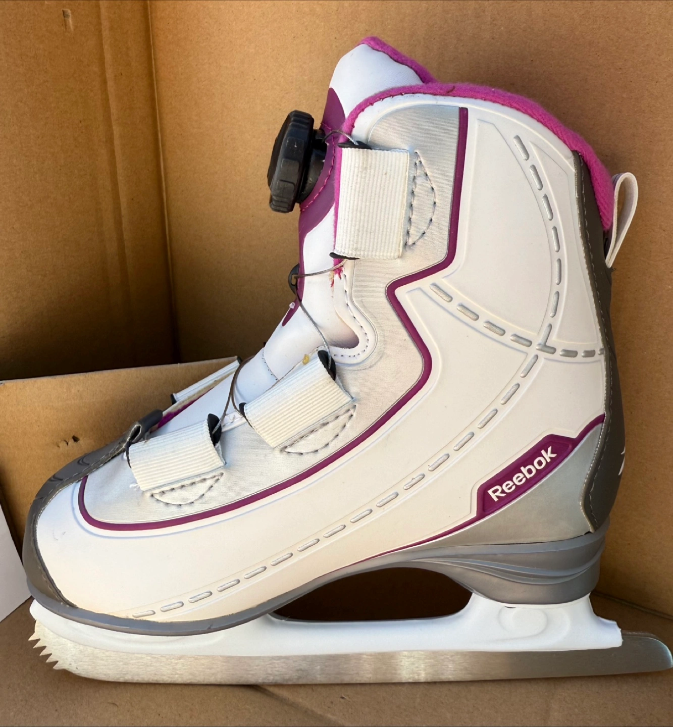 10Features: Brand: Reebok Model: BOA Size 2 Width D Colour: White with Pink trim Insulated hard plastic boot shell with nylon & textile insole BOA fit system lace up Condition: Brand new Regular price $135.00 Toronto pick up