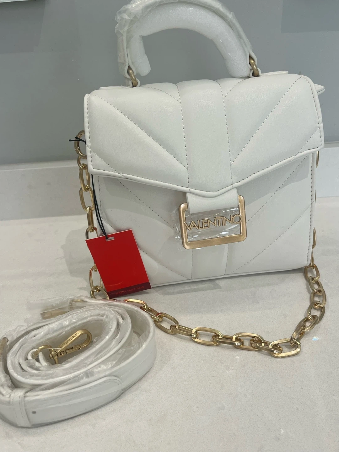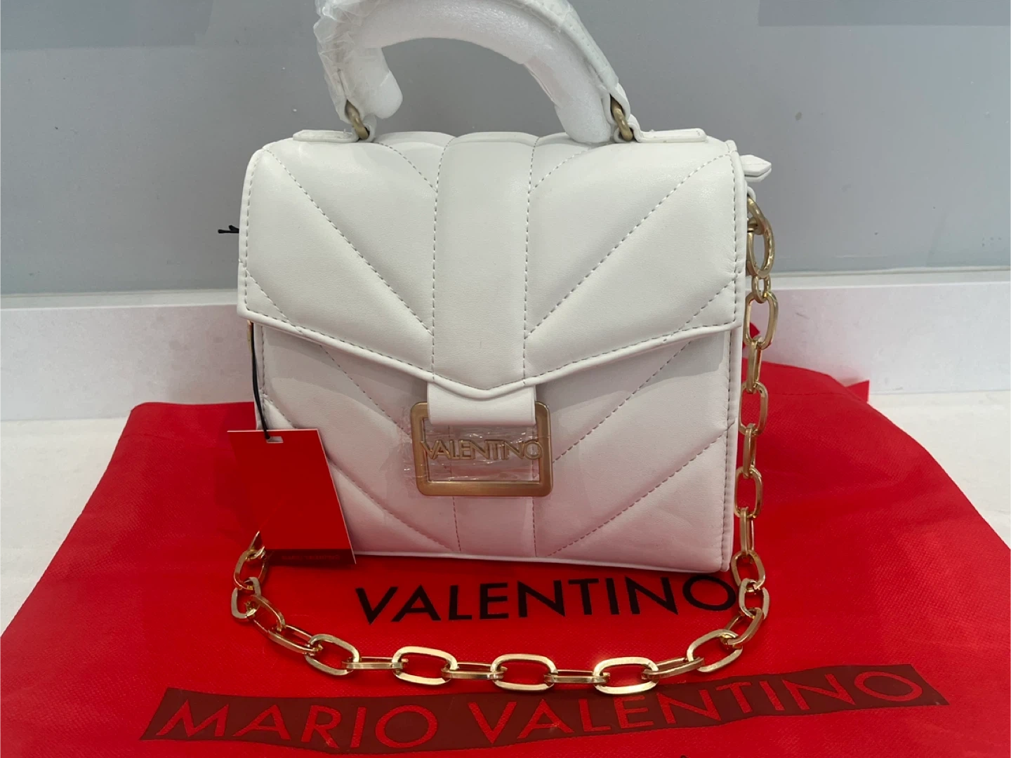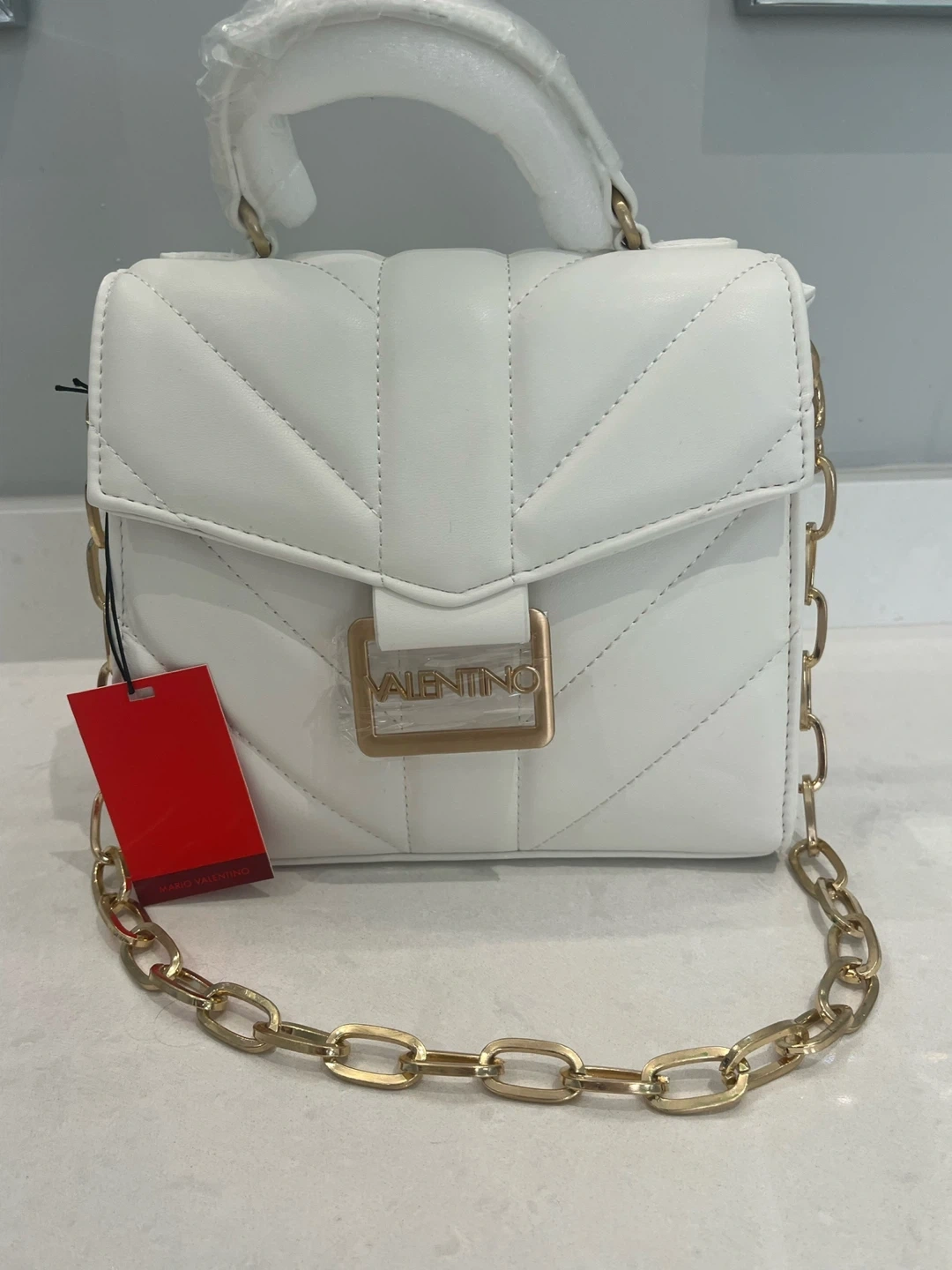 This is a brand new Mario Valentino white leather top handle bag. It features a gold chain and comes with an additional strap. Perfect for adding a touch of elegance to any outfit!