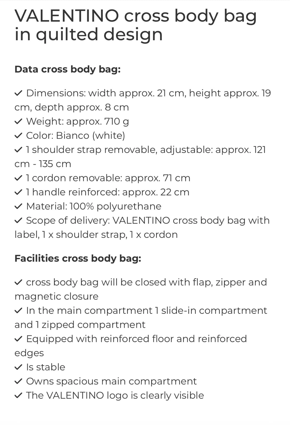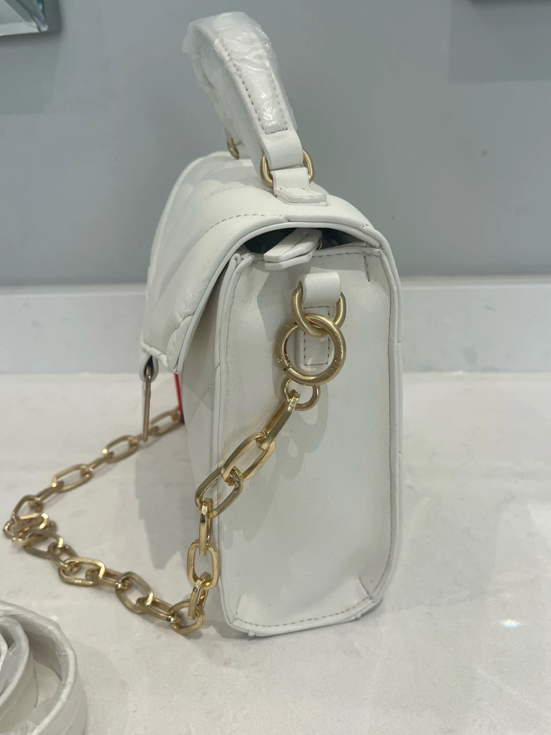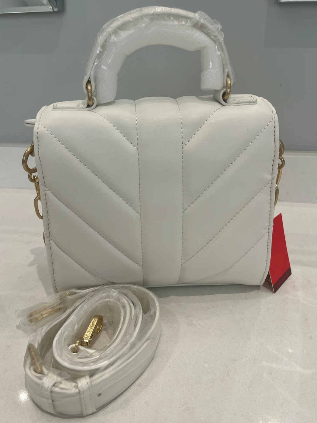 This is a brand new Mario Valentino white leather top handle bag. It features a gold chain and comes with an additional strap. Perfect for adding a touch of elegance to any outfit!