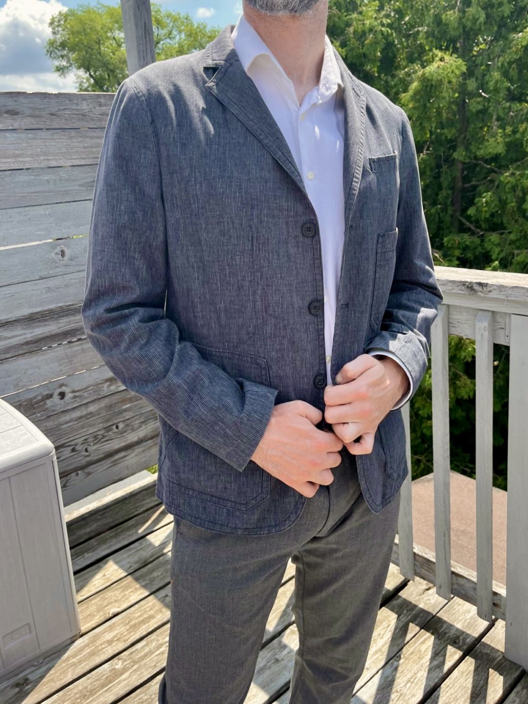 Hi! I’m selling a men's casual blazer in a stylish blue striped pattern. It's in great condition and perfect for adding a touch of sophistication to your everyday look! The jacket features a classic cut with a button-up front and functional pockets.
