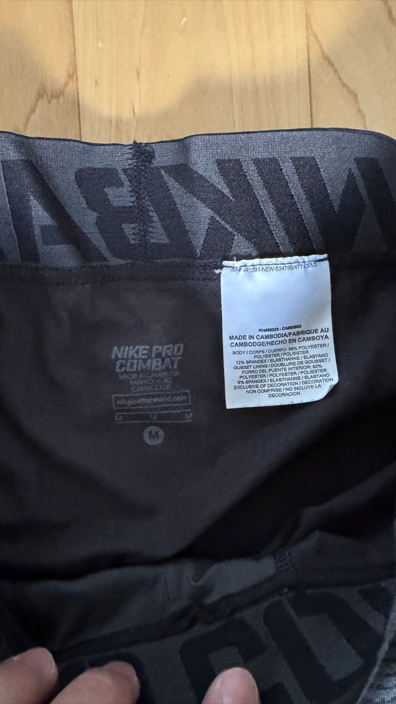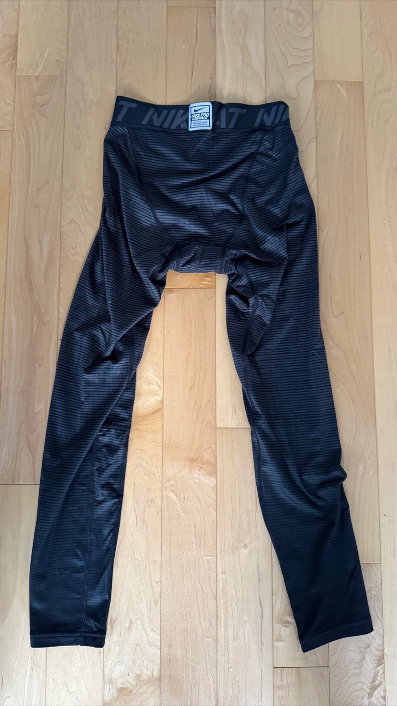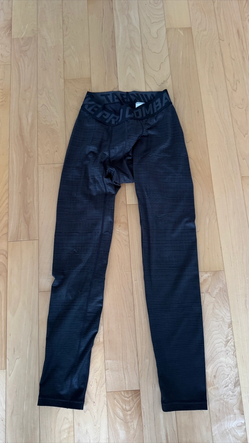 Selling a pair of Nike Pro Combat tights in size medium! They're in great shape and ready for a new home. Perfect for workouts or layering during colder weather. They are black with a subtle striped pattern.