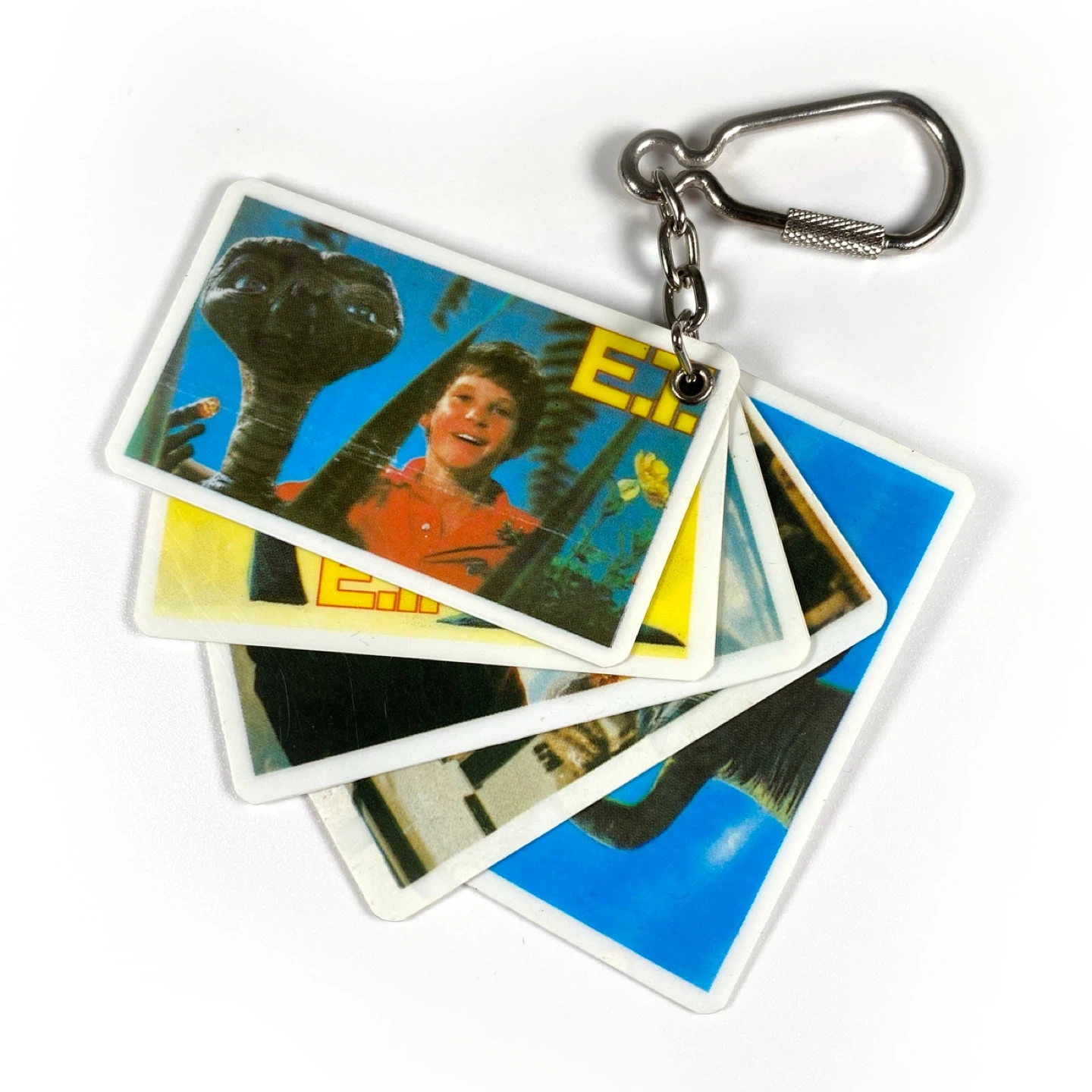 Vintage 1982 E.T. the Extra Terrestrial keychain, with 10 images from the movie.