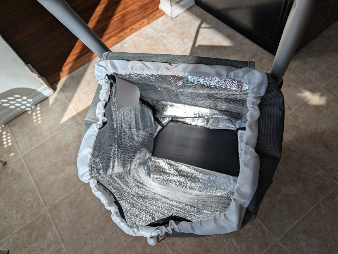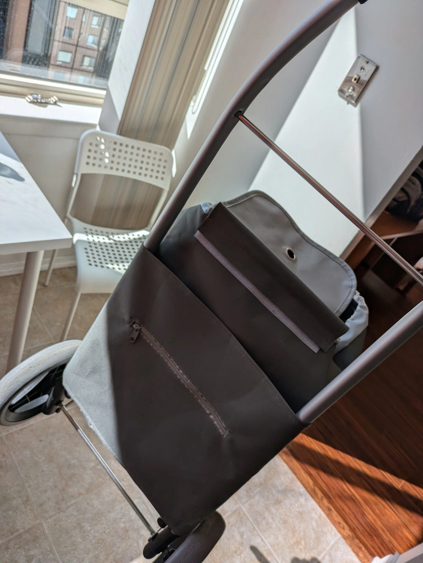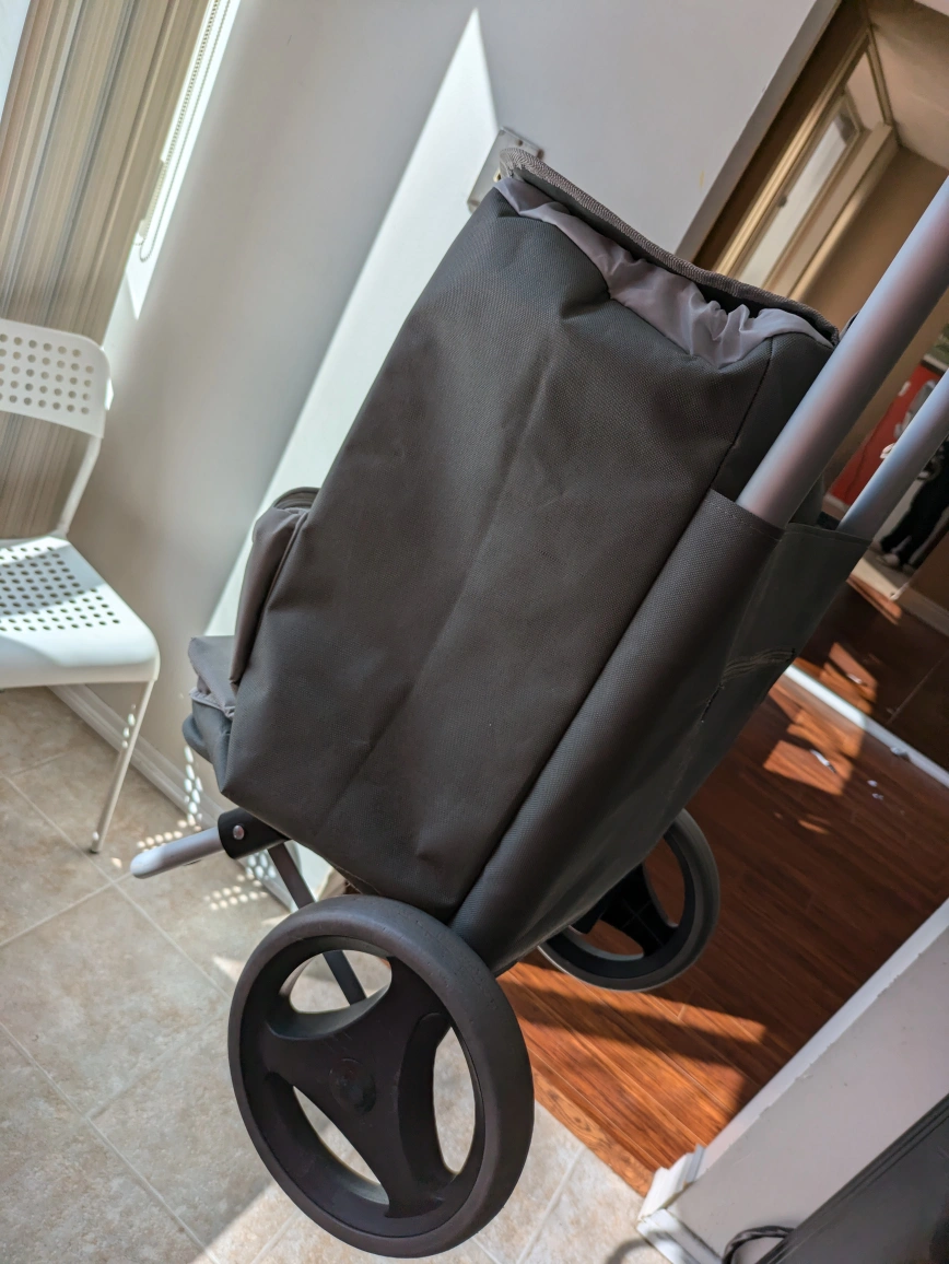 Selling a handy grey shopping trolley cart! It's in great shape and ready to help with your grocery runs or market trips. The trolley features a spacious bag with a drawstring closure and a zippered front pocket for extra storage. The interior is lined with a reflective material, for insulation. It's a practical and convenient way to carry your items! Bought from amazon for 50 and only used twice ever :)