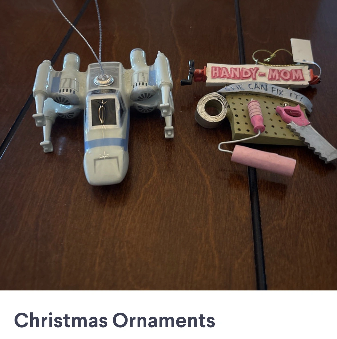 70Selling a set of two Christmas ornaments! One is a Star Wars X-Wing fighter and the other is a "Handy-Mom" themed ornament with tools