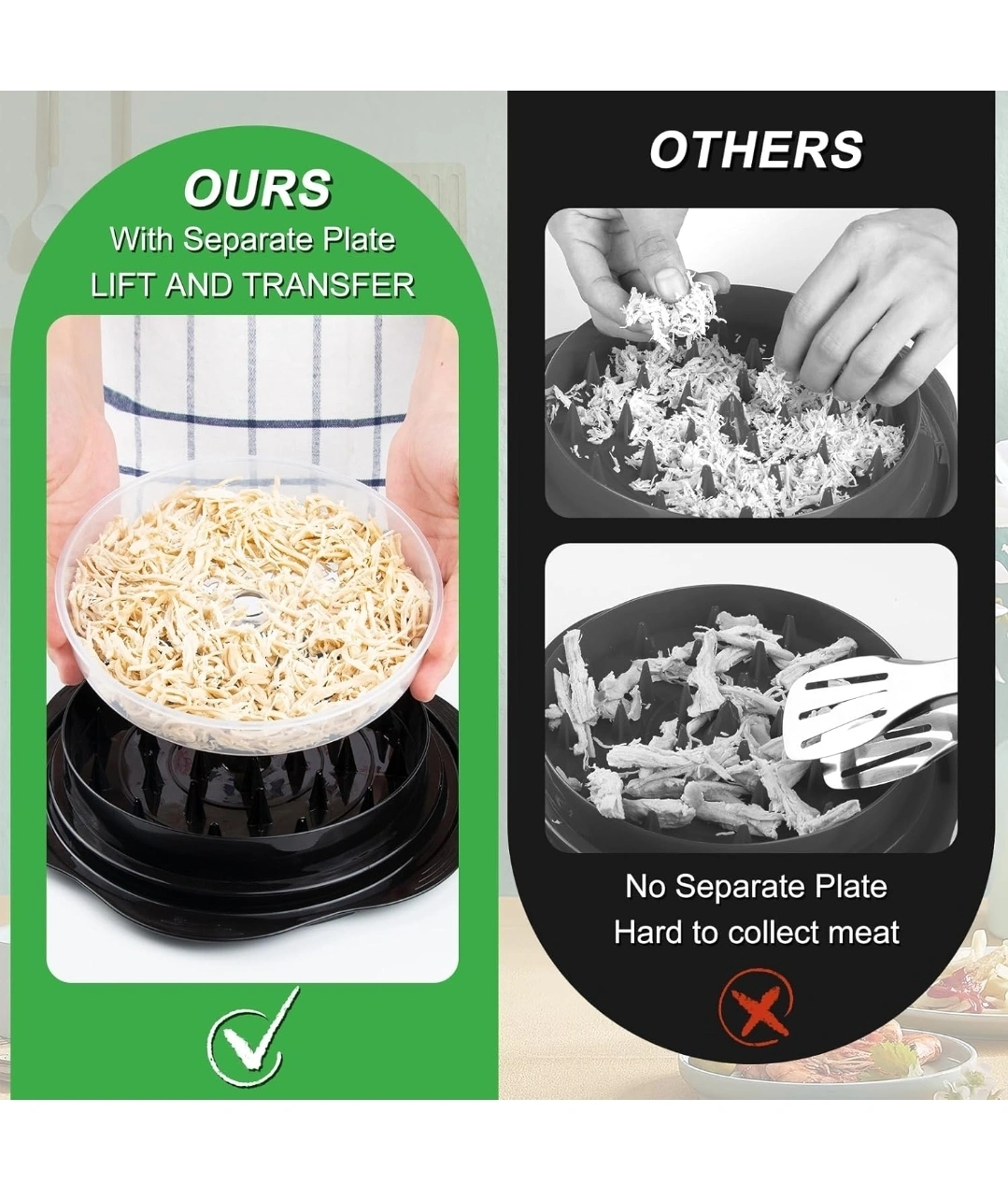 This meat shredder tool makes shredding cooked meat super easy! It's easy to use and dishwasher-safe for easy cleanup. It has an ergonomic handle and a transparent cover so you can see how shredded the meat is Upgrade Chicken Shredder, Chicken Breast Shredding Tool Twist Large, Meat Twister with Separate Plate, Non-Slip Bottom, Ergonomic Handle, Suitable for All Kinds of Cooked Meat and Salad, Black One of the handles is missing as shown in the last photo with an X.