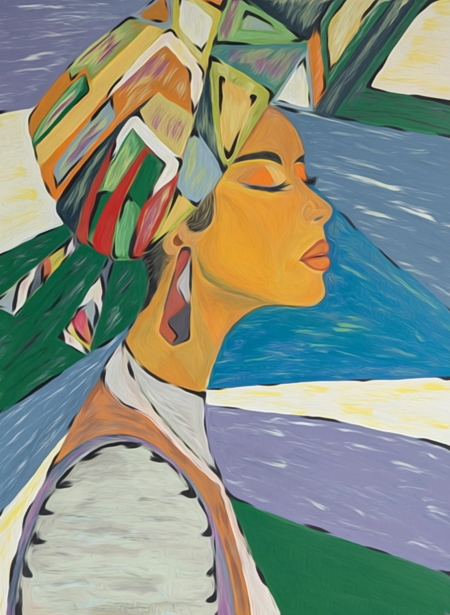 Subject: A vibrant, figurative portrait of a woman in profile.