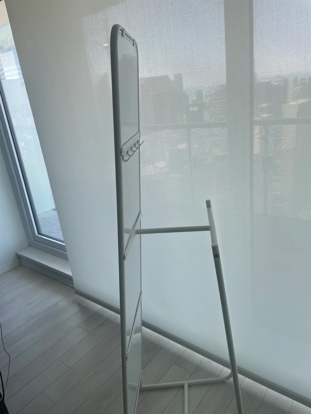 Here's a standing mirror that also has a rack! It's perfect for adding a touch of style and functionality to any room. The mirror is in great shape and the rack is super handy for hanging clothes or accessories. It's a great piece to have and will look great in your home!