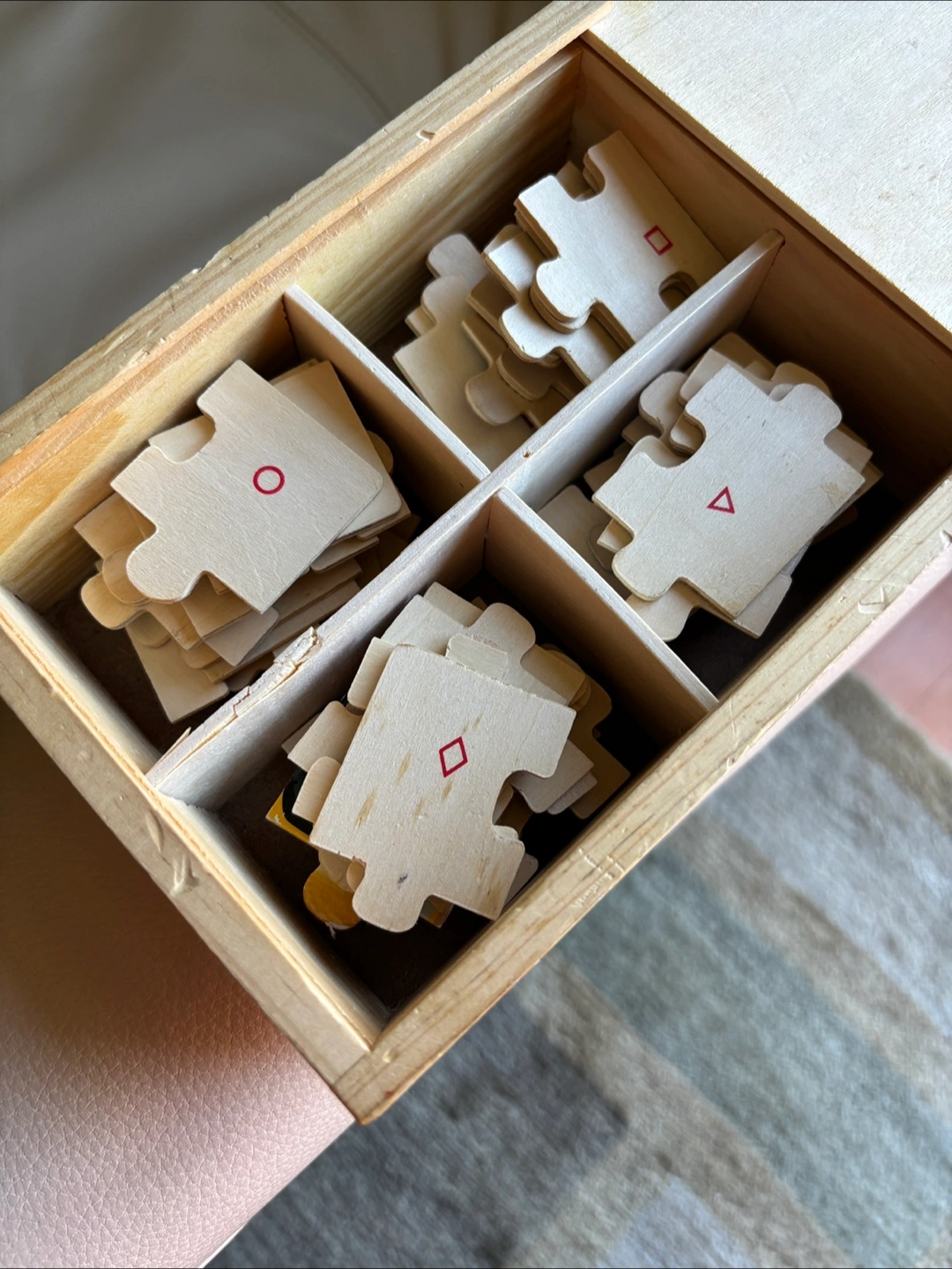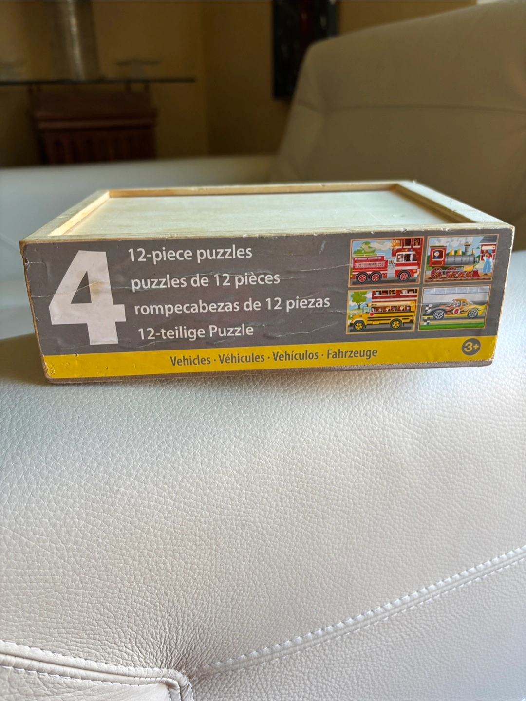 Selling a Melissa & Doug 4 Wooden Puzzles set, featuring vehicles! This set includes 4 puzzles, each with 12 pieces, all neatly contained in a wooden box. The puzzles depict a fire truck, train, school bus, and race car. Suitable for ages 3+