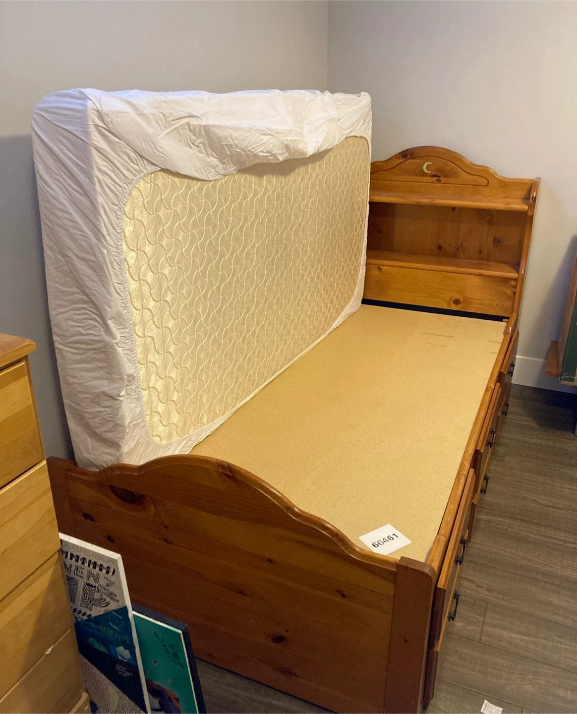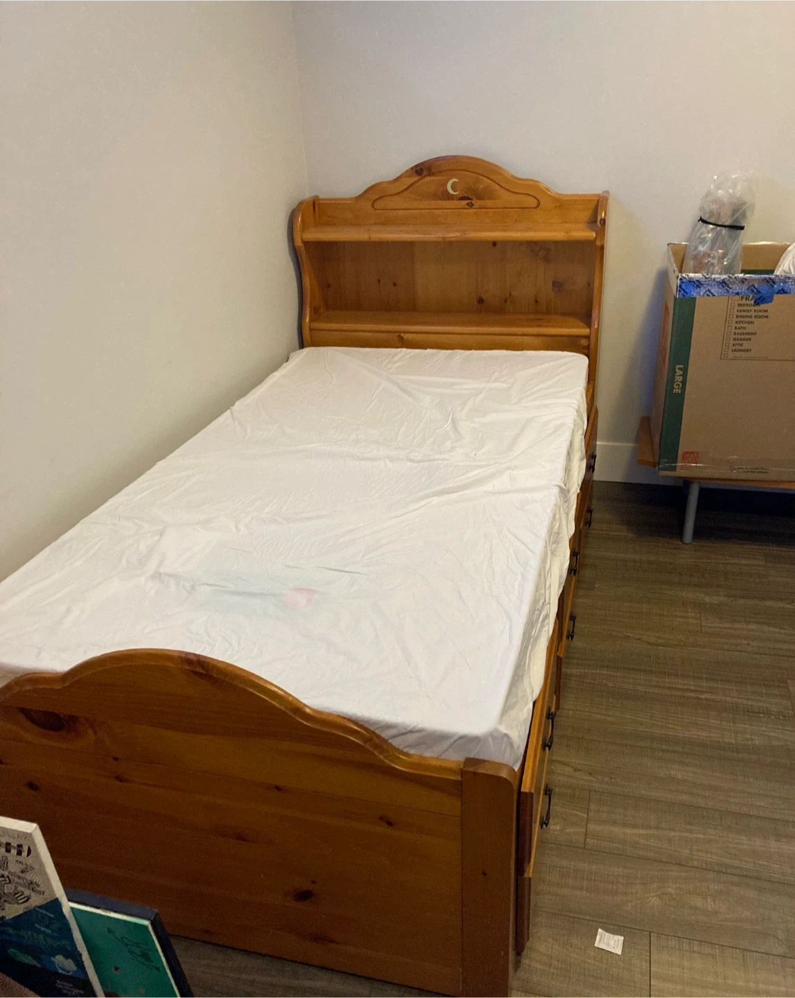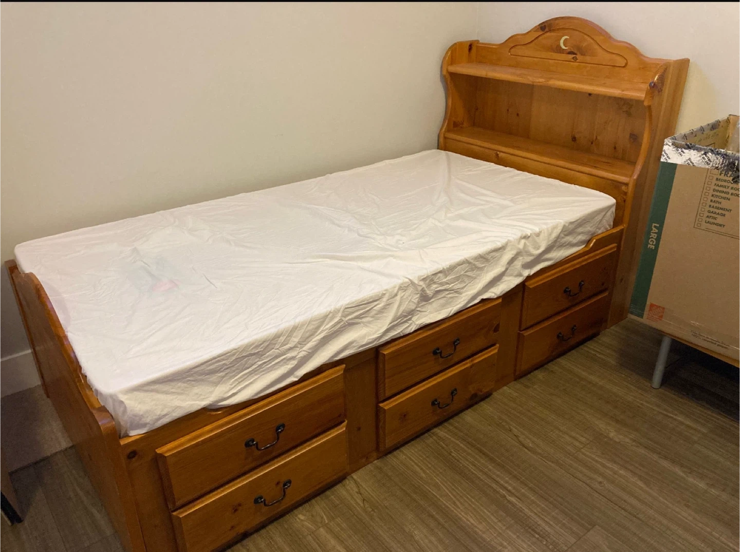 Selling a solid wood single bed frame that comes with built-in storage drawers and a headboard with a shelf. It's in good condition and perfect for a kid's room or guest room. Mattress included Located in Evanston
