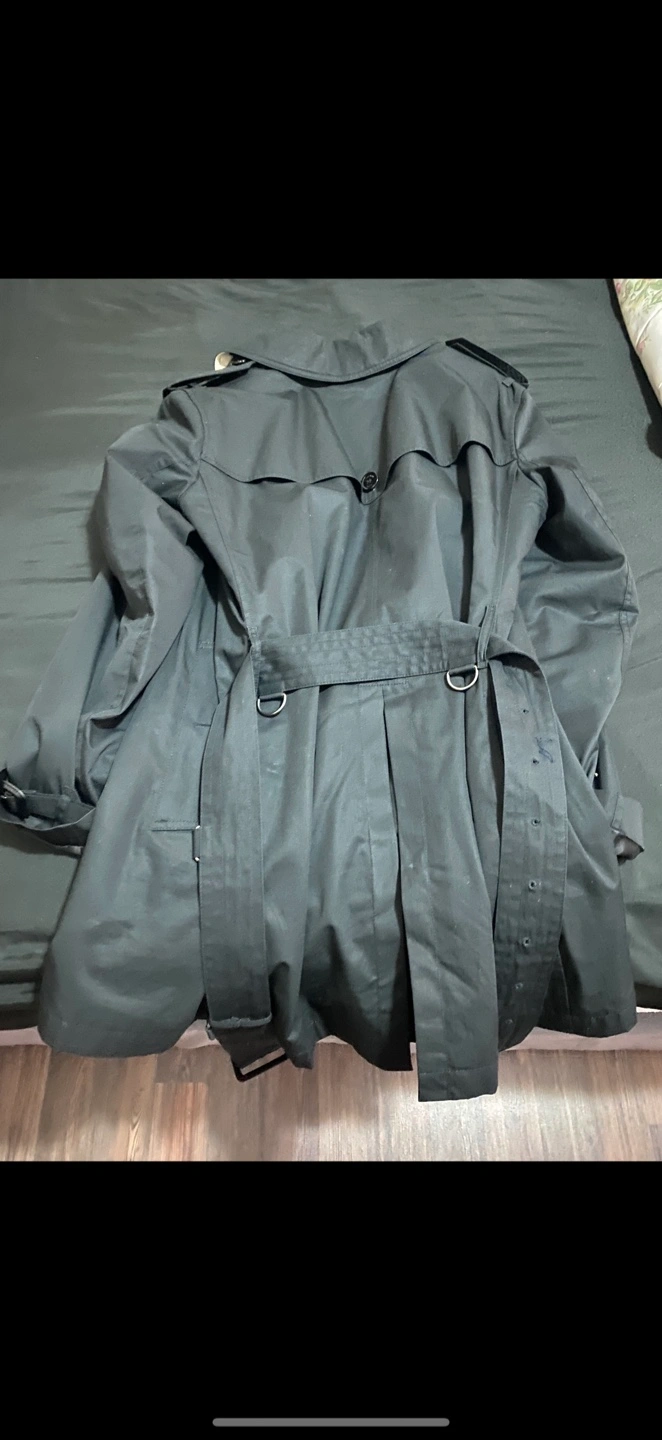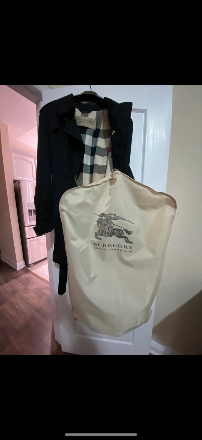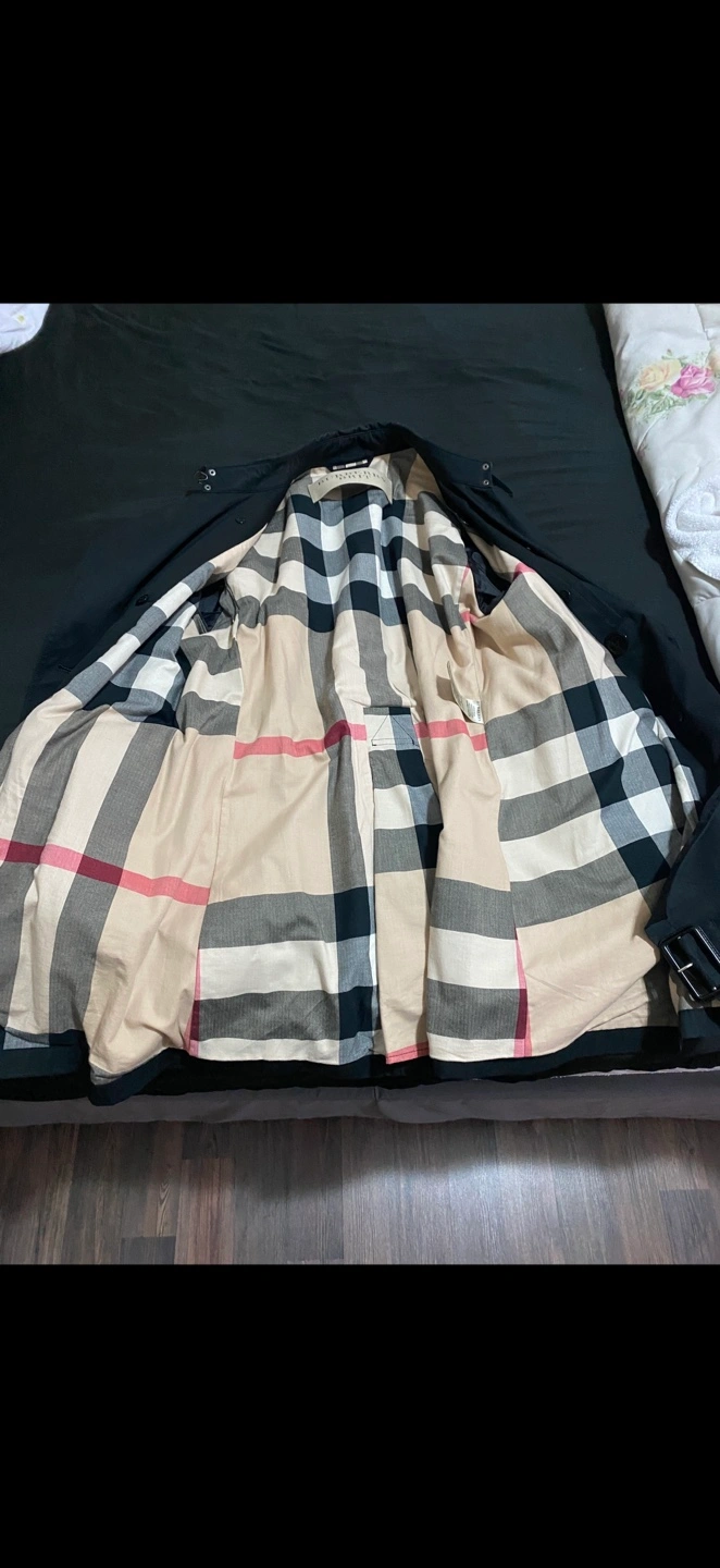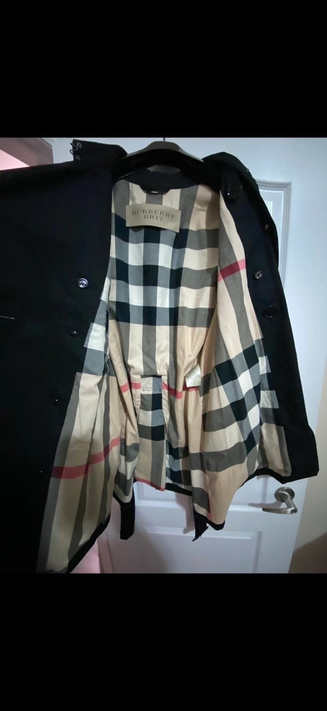 Selling a classic Burberry trench coat in black. It features the iconic Burberry check lining. It's in great condition and ready for a new home!