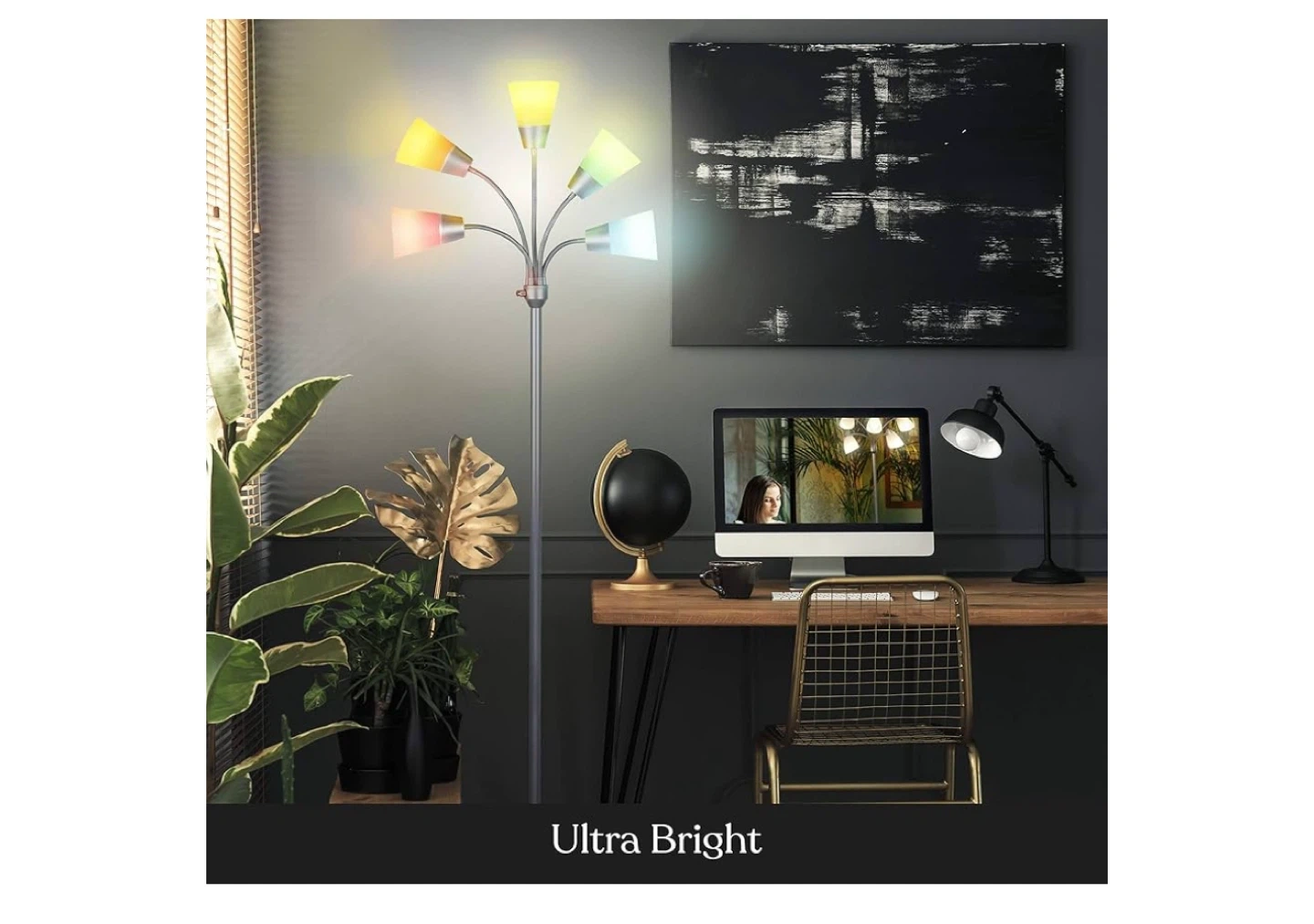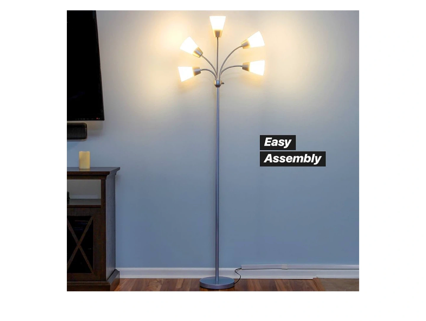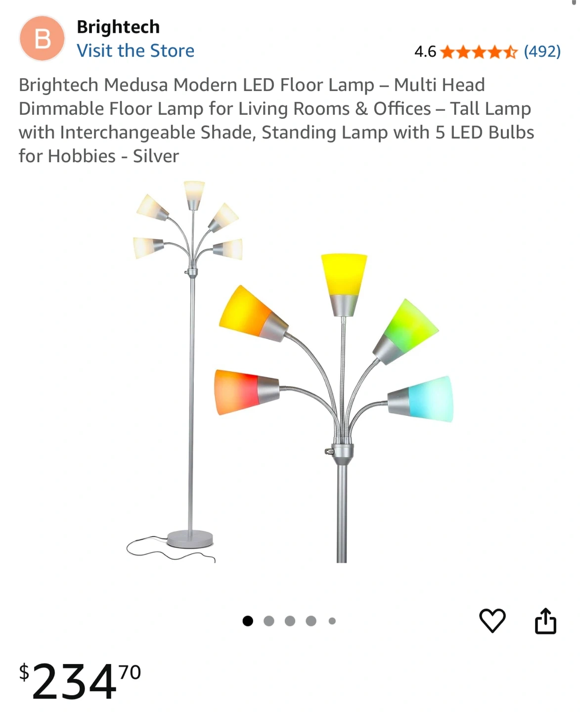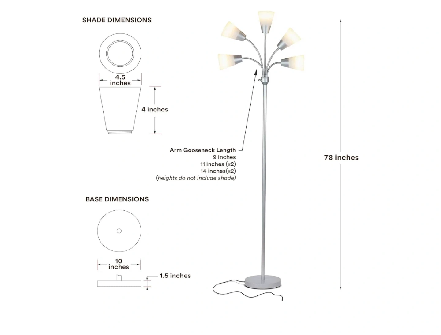 Looking to brighten up your space? This Brightech Medusa Modern LED Floor Lamp is perfect for living rooms and offices! It features a multi-head design with 5 LED bulbs, and interchangeable shades. The lamp has a sturdy base and is easy to assemble. The height is 78 inches, shade dimensions are 4.5 inches diameter and 4 inches height, and the base is 10 inches diameter and 1.5 inches height. Originally bought for $234.70