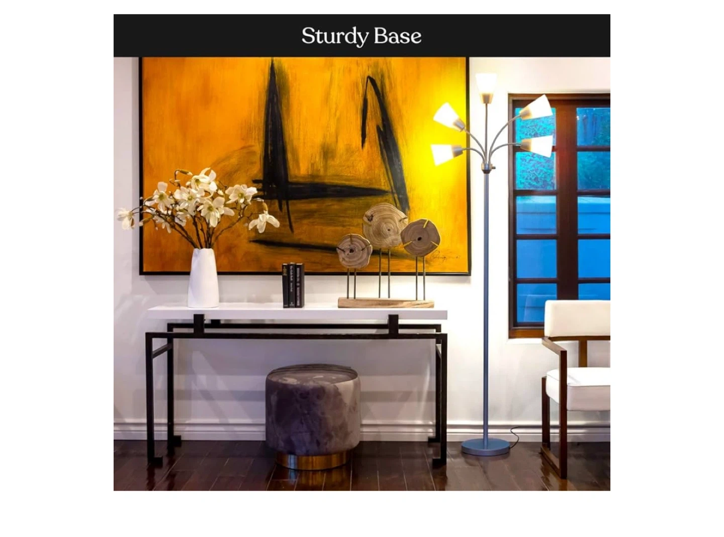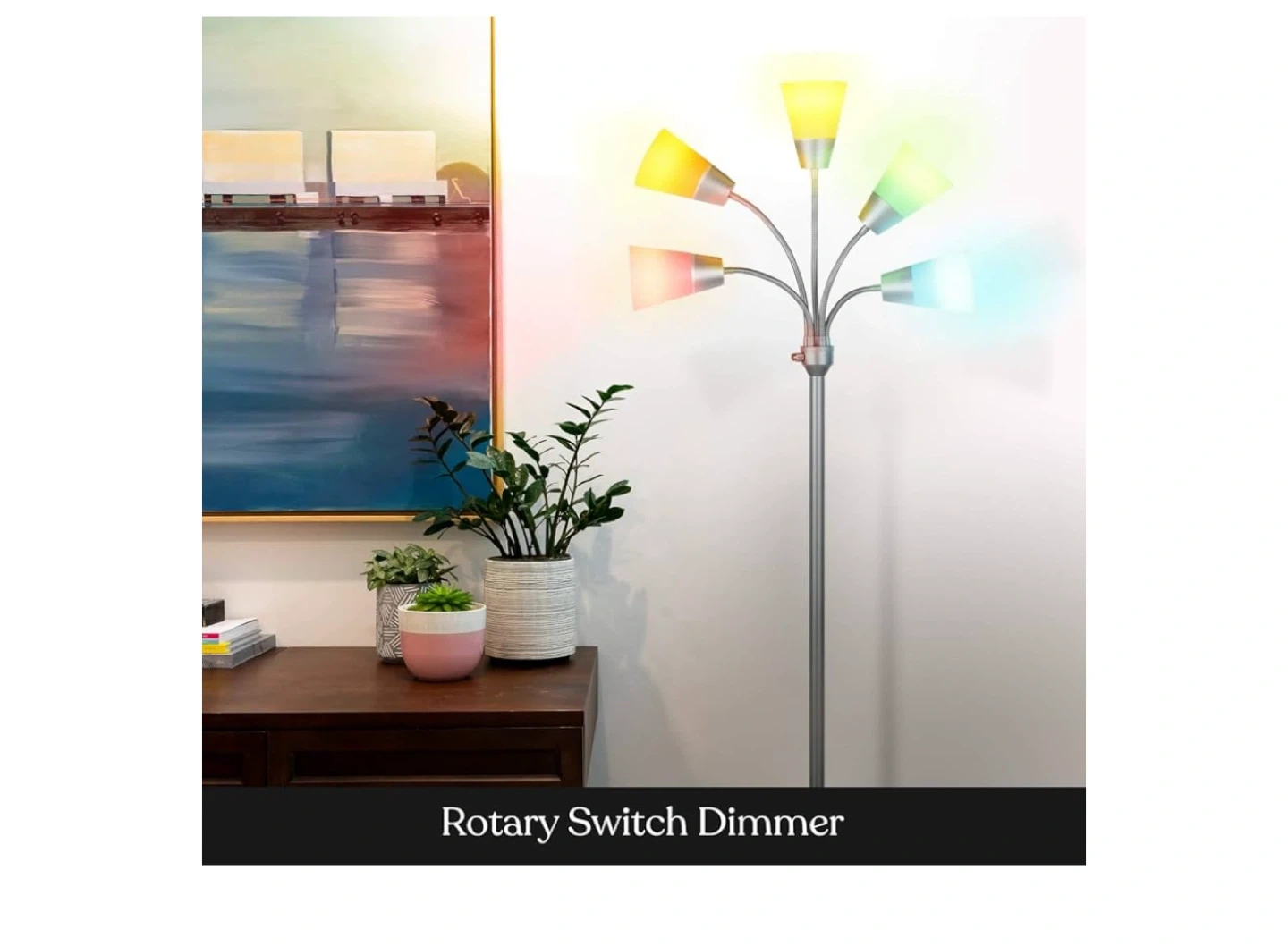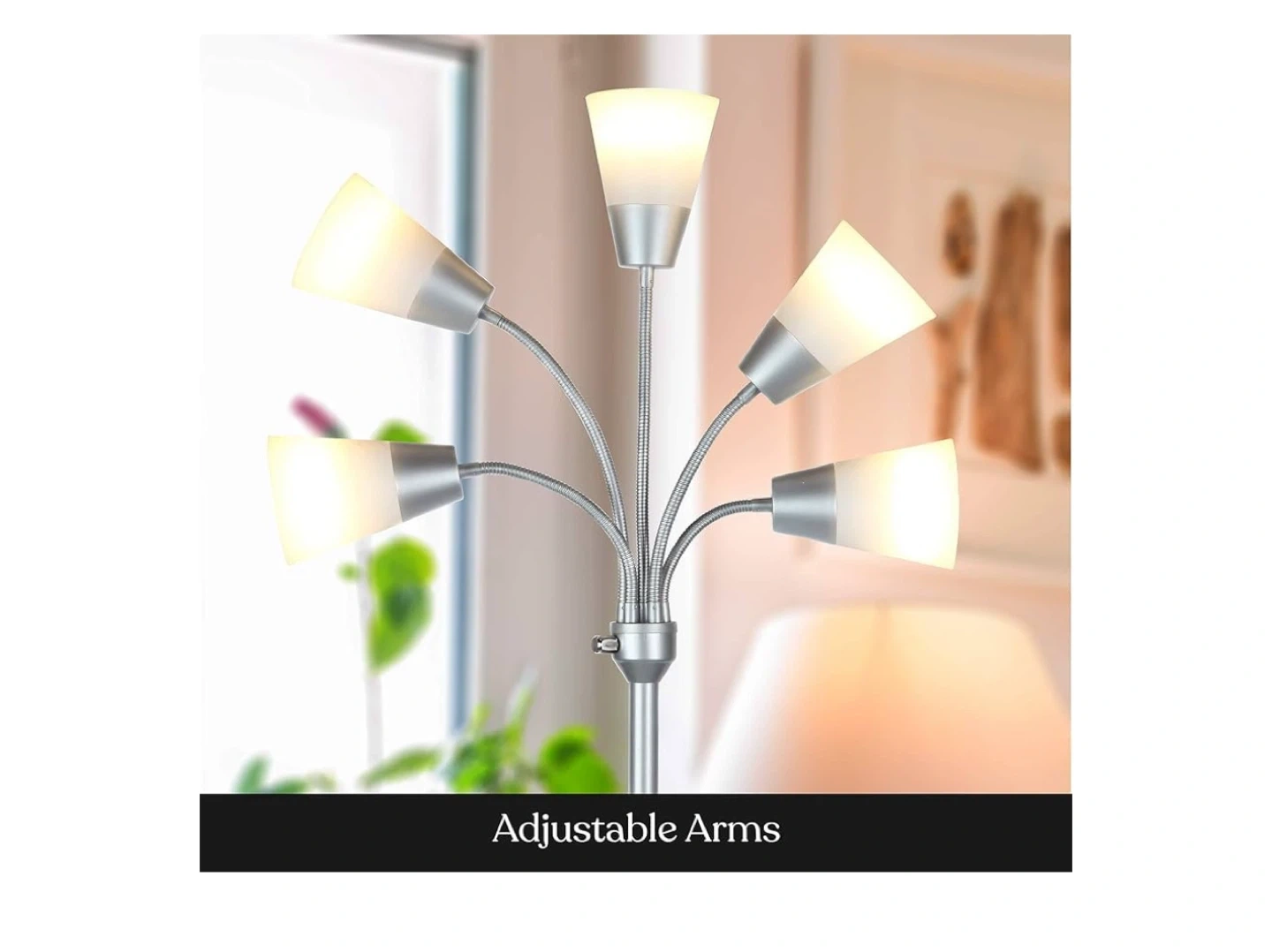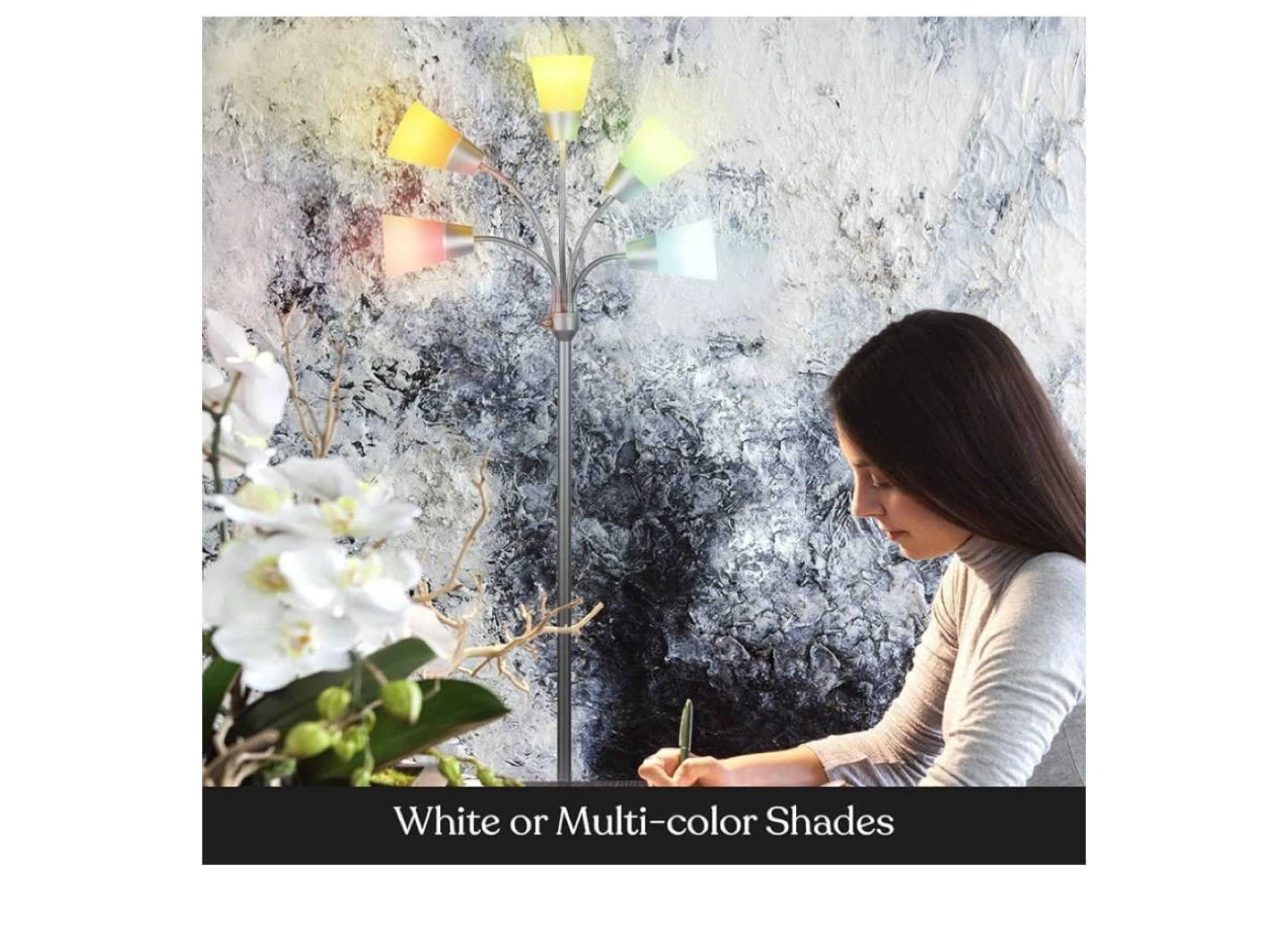 Looking to brighten up your space? This Brightech Medusa Modern LED Floor Lamp is perfect for living rooms and offices! It features a multi-head design with 5 LED bulbs, and interchangeable shades. The lamp has a sturdy base and is easy to assemble. The height is 78 inches, shade dimensions are 4.5 inches diameter and 4 inches height, and the base is 10 inches diameter and 1.5 inches height. Originally bought for $234.70