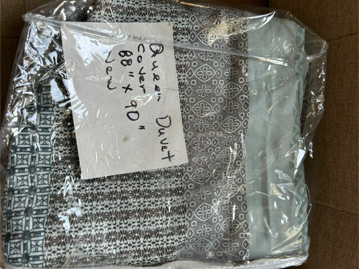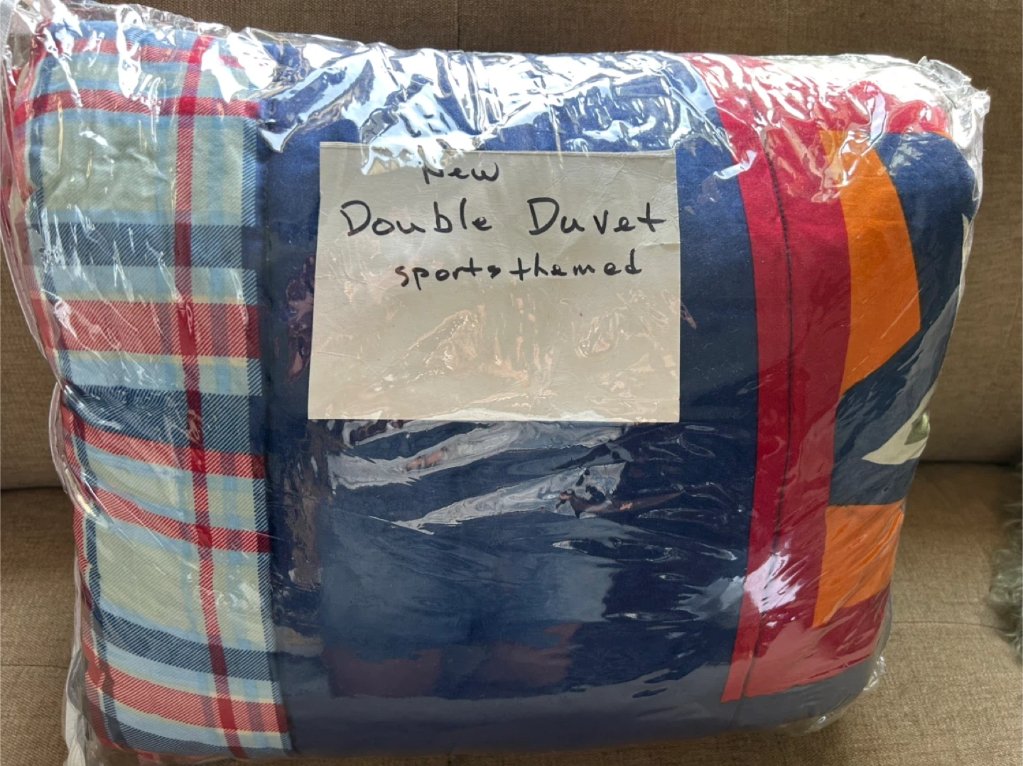 Selling a brand new queen duvet cover set. It includes the duvet cover, shams, and a pillow. The duvet cover measures 88" x 90". $40 each