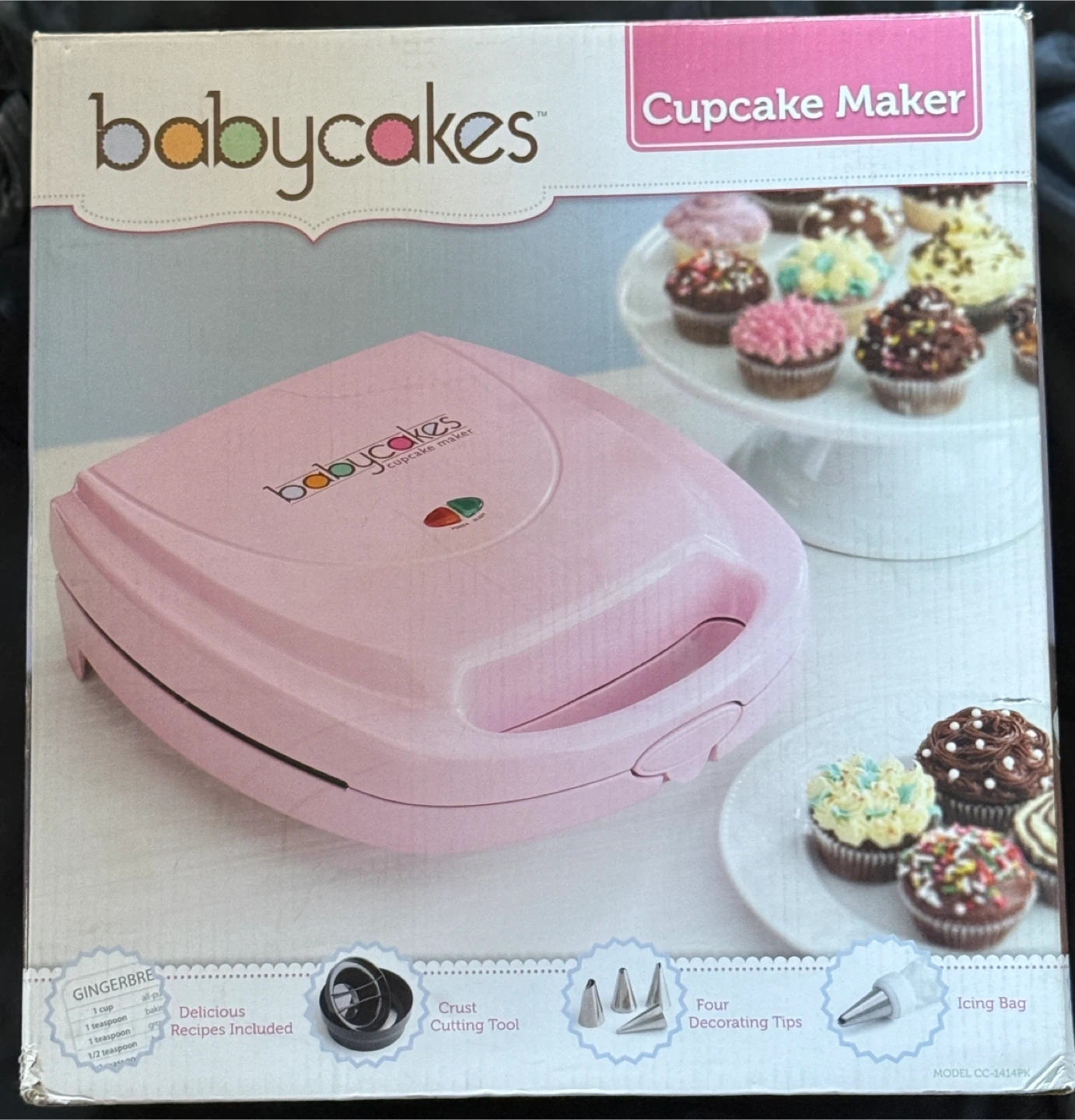 Selling a brand new Babycakes Cupcake Maker, ready to help you bake some delicious treats. The box includes a crust cutting tool, four decorating tips, and an icing bag. Recipes are also included to get you started!