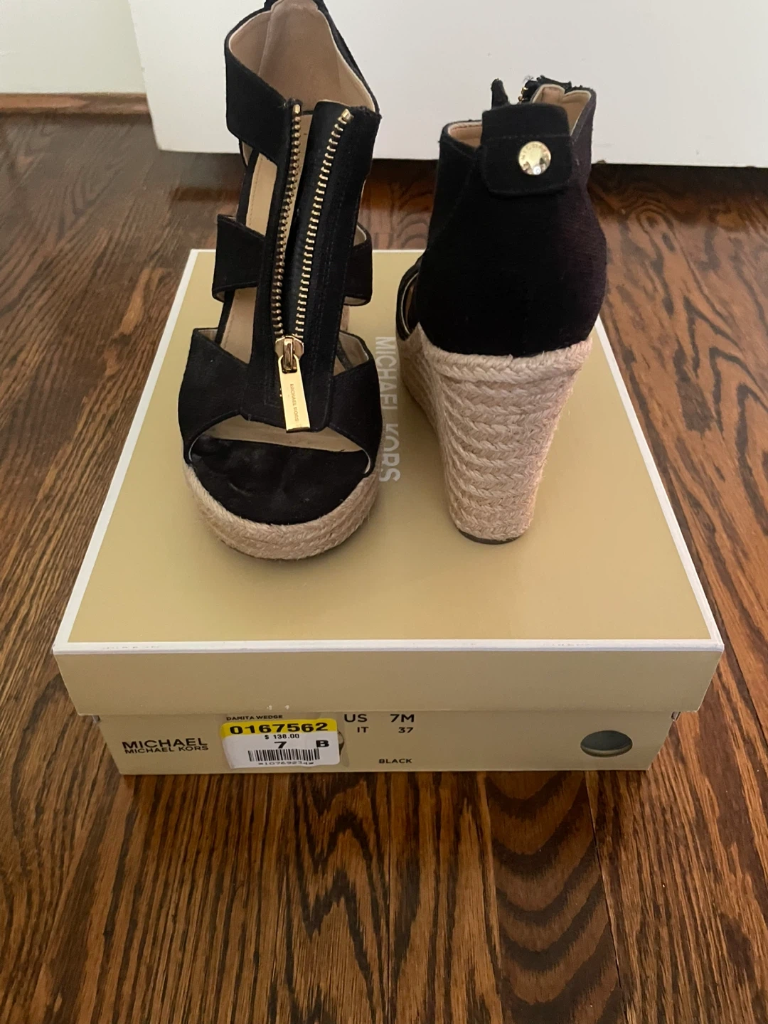 Selling a pair of Michael Kors Damita Wedge sandals in size 7M! They are black and feature a stylish wedge heel. The original price was $138.00. Comes with the box!
