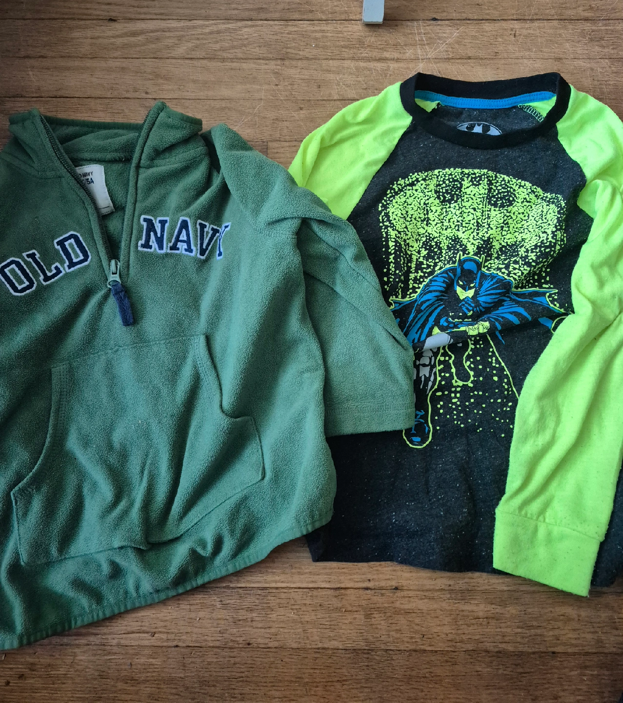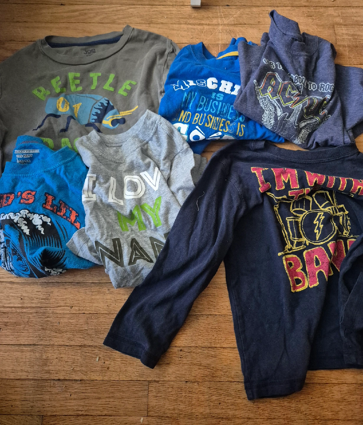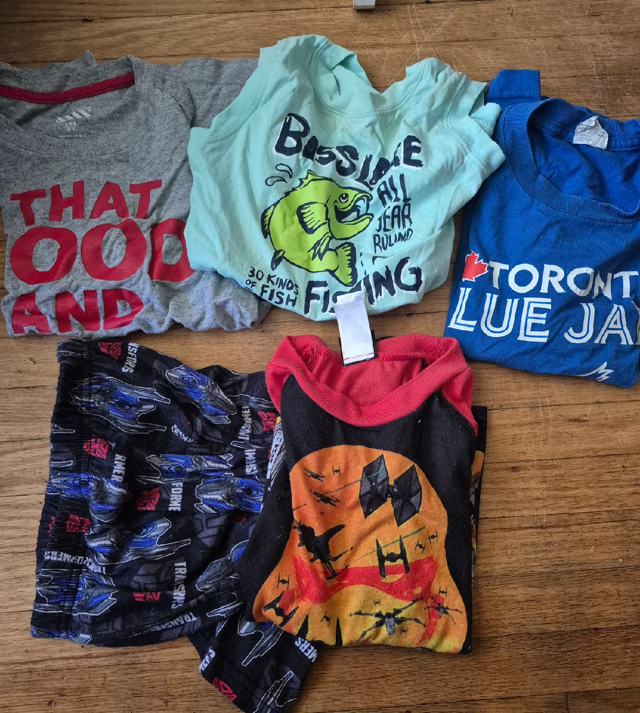 I'm selling a variety of kids' clothing items. There are shirts, shorts, and a fleece hoodie. Some of the brands include Old Navy and Joe. Many items have character designs like Batman, Star Wars, and Teenage Mutant Ninja Turtles. Perfect for a growing child!