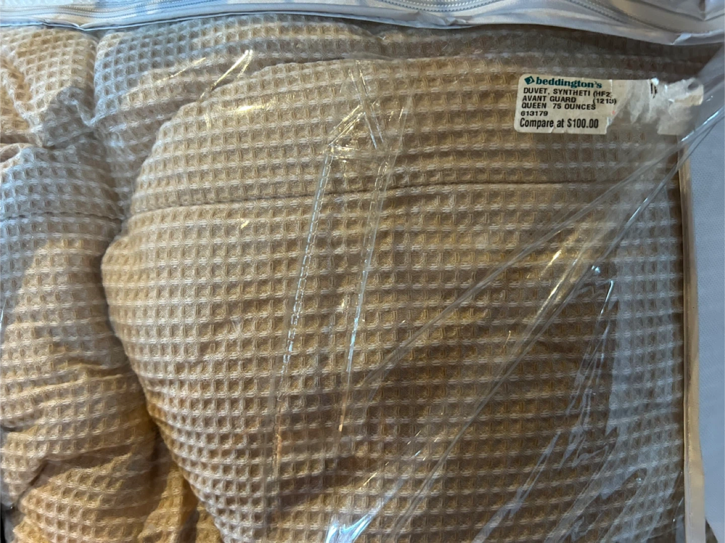 Selling a brand new Heddington queen duvet cover! It's a synthetic duvet, and it weighs 75 ounces. The original price was $100. The waffle pattern is so nice!