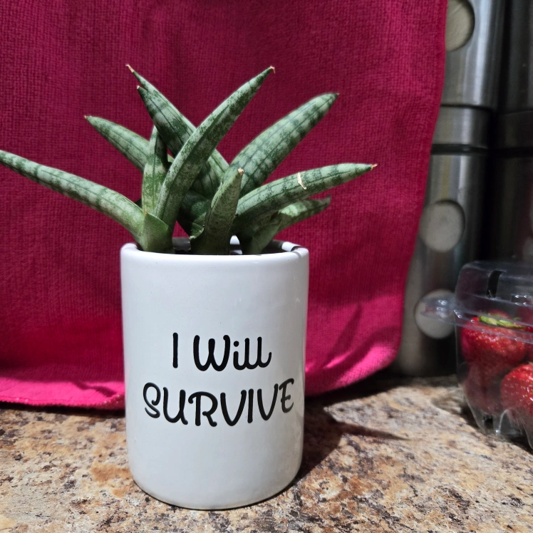 Selling a healthy Sansevieria Cylindrica, also known as a snake plant, potted in a cute white ceramic pot. The pot has the text "I Will SURVIVE" printed on it. This plant is super easy to care for and great for adding a touch of greenery to your space