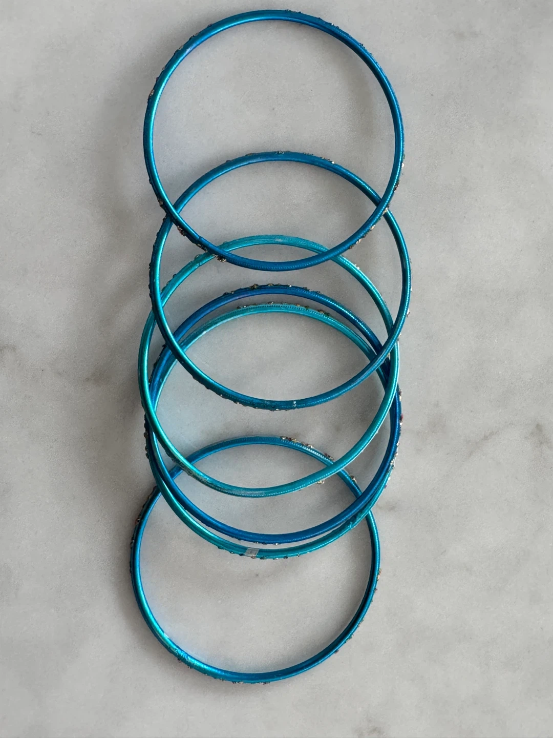 Selling a set of 6 bangles in varying shades of blue! They have small decorative stones embedded in them. Perfect for adding a pop of colour to your outfit