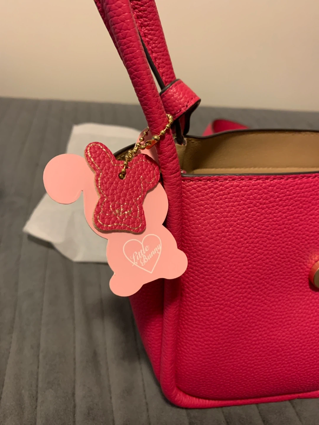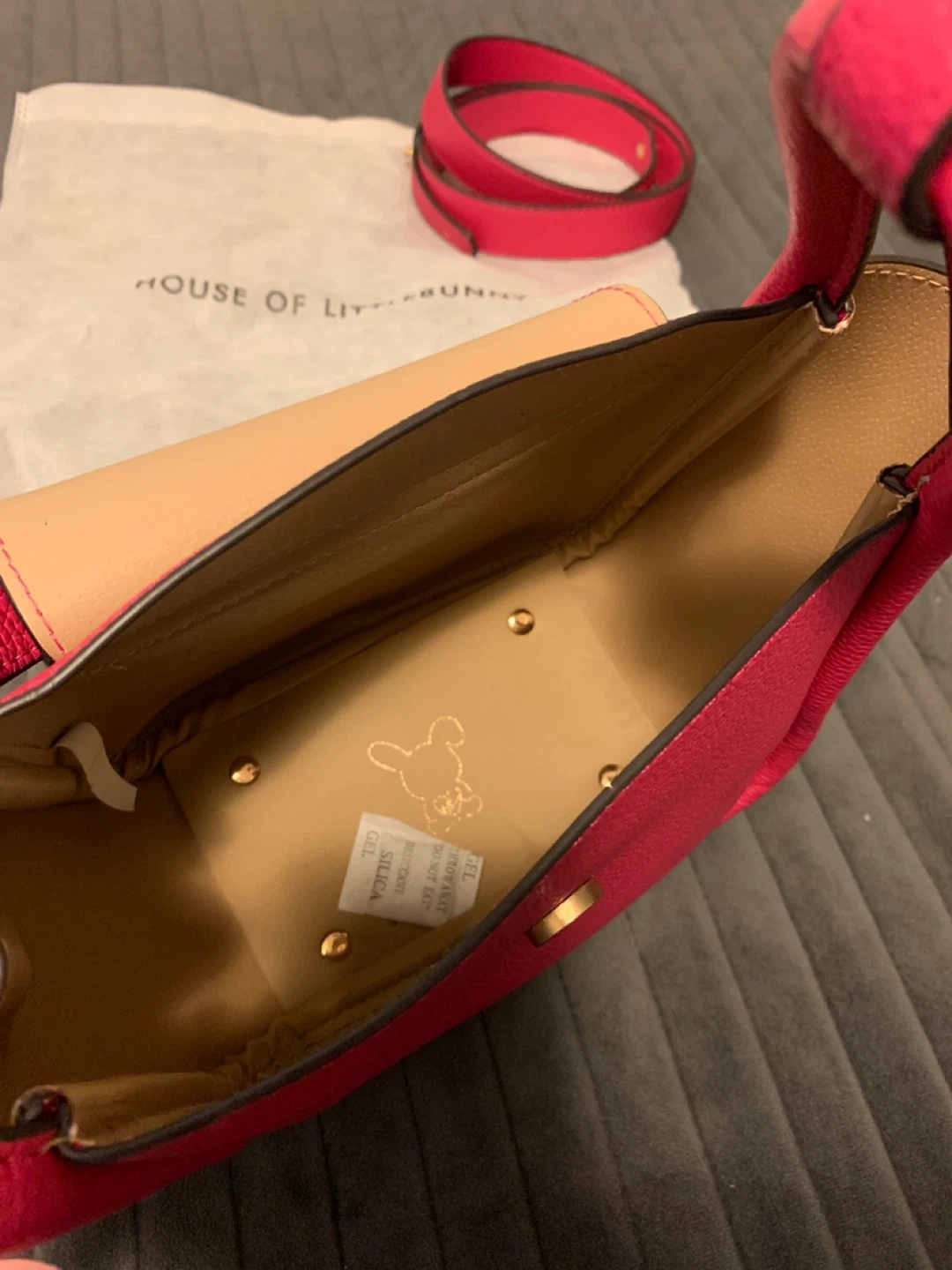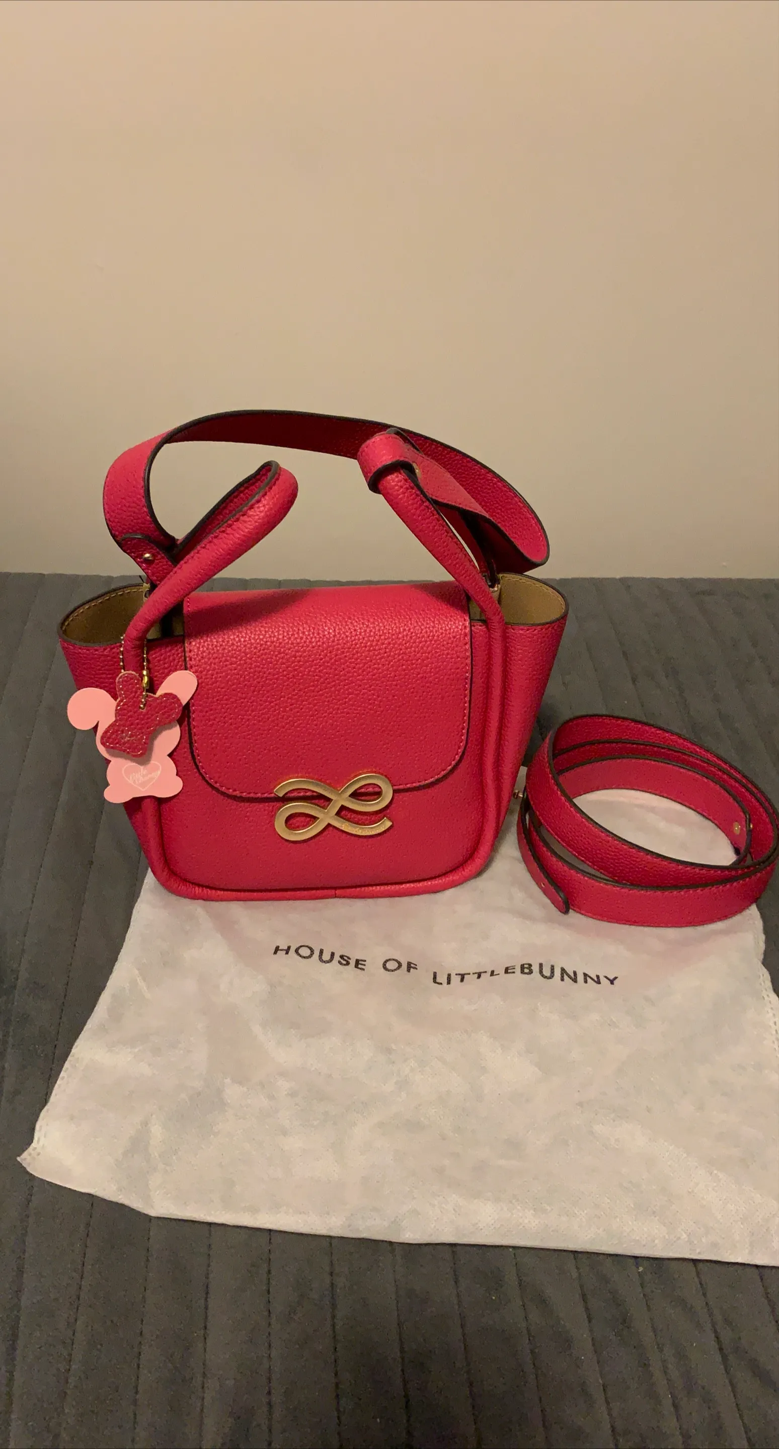 Selling a cute House of Little Bunny handbag in a vibrant pink colour! It comes with a detachable strap and a dust bag for storage. The bag features the brand's logo and a charming bunny-shaped charm. It's in great condition and ready for a new home!