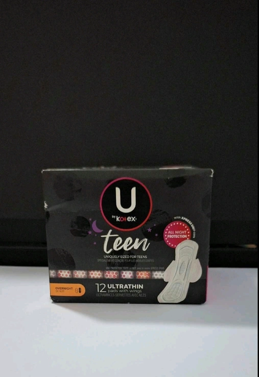 Selling a box of U by Kotex Teen Ultrathin pads with wings. These are uniquely sized for teens and offer all night protection with XPRESS DRI technology. There are 12 pads in the box