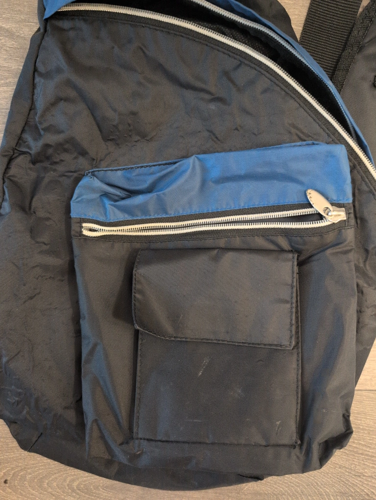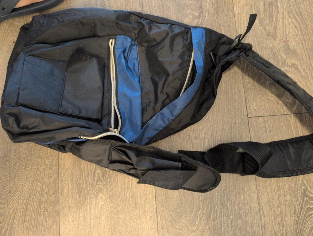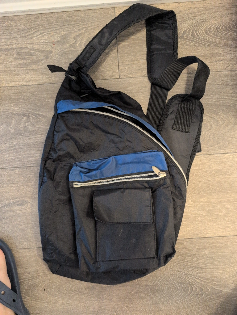 Here's a black and blue sling bag! It's in great condition and ready for a new home. Perfect for carrying your essentials while keeping your hands free... also works on cycle...